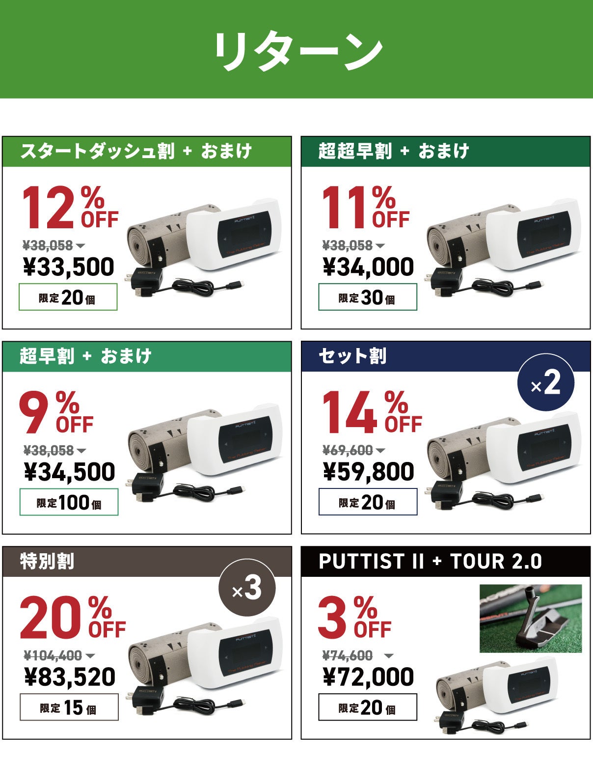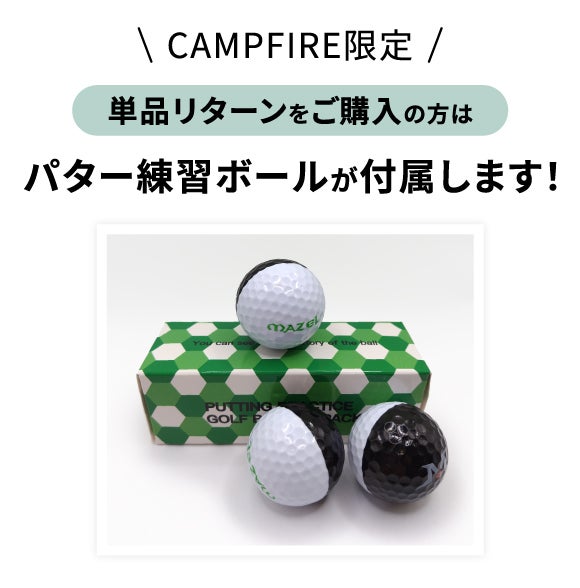 単品リターンの「スタートダッシュ割」「超超早割」「超早割」をご購入いただいた方に、MAZEL (マゼル) パター練習ボールをセットにお付けいたします!