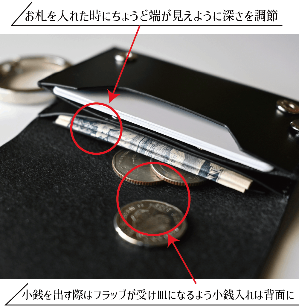 カードサイズの大きさに、鍵2本、カード3枚〜5枚、お札4枚〜6枚、小銭10枚〜15枚収納可能な万能アイテム。