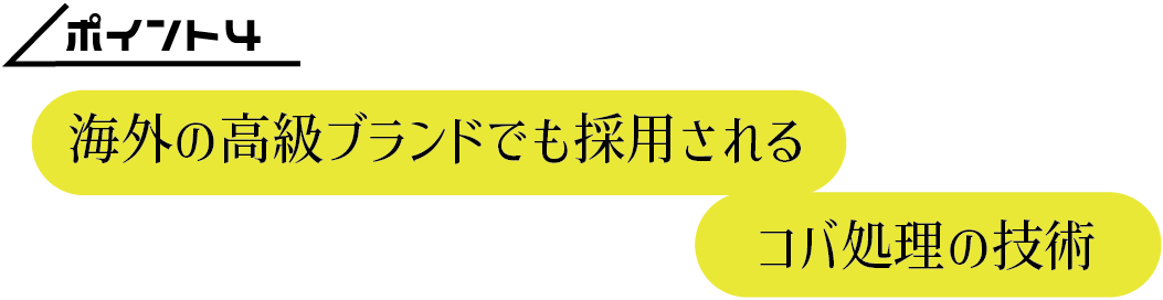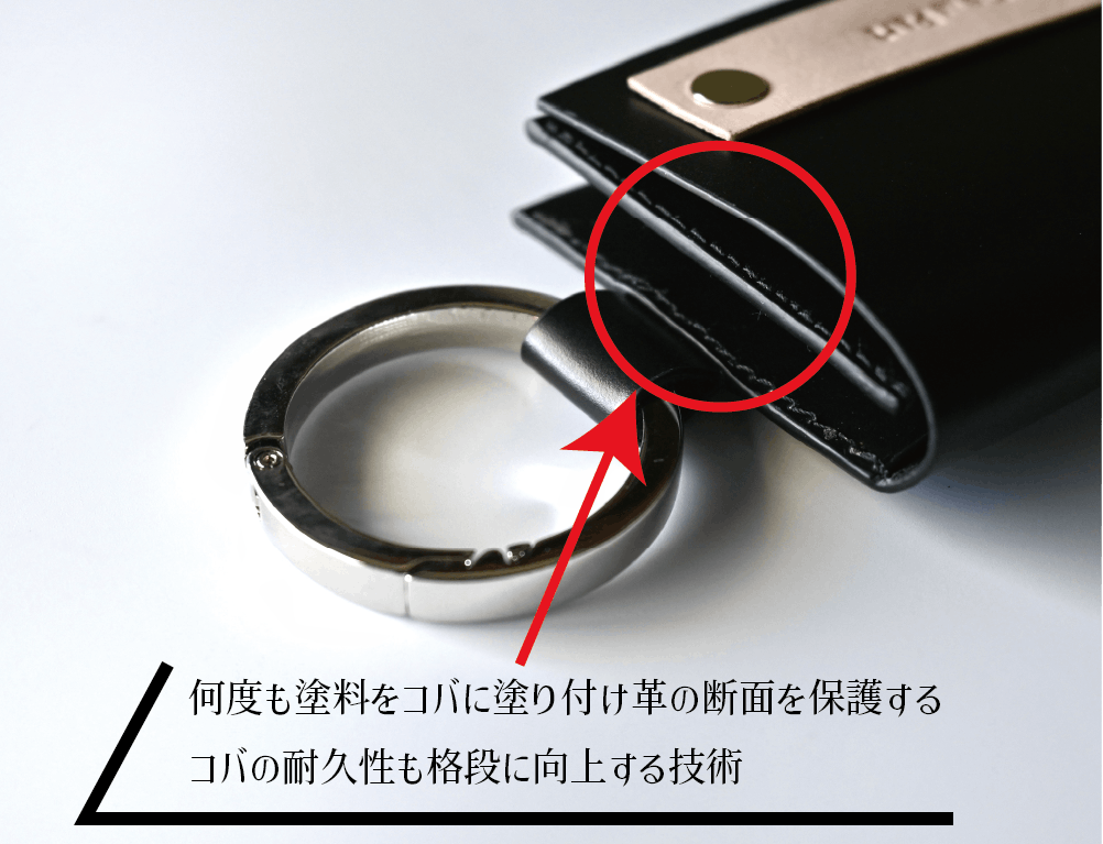 イタリア、フェニーチェ社が製造する皮革用水性コバ塗料を使用し、コバを丁寧に処理しています。