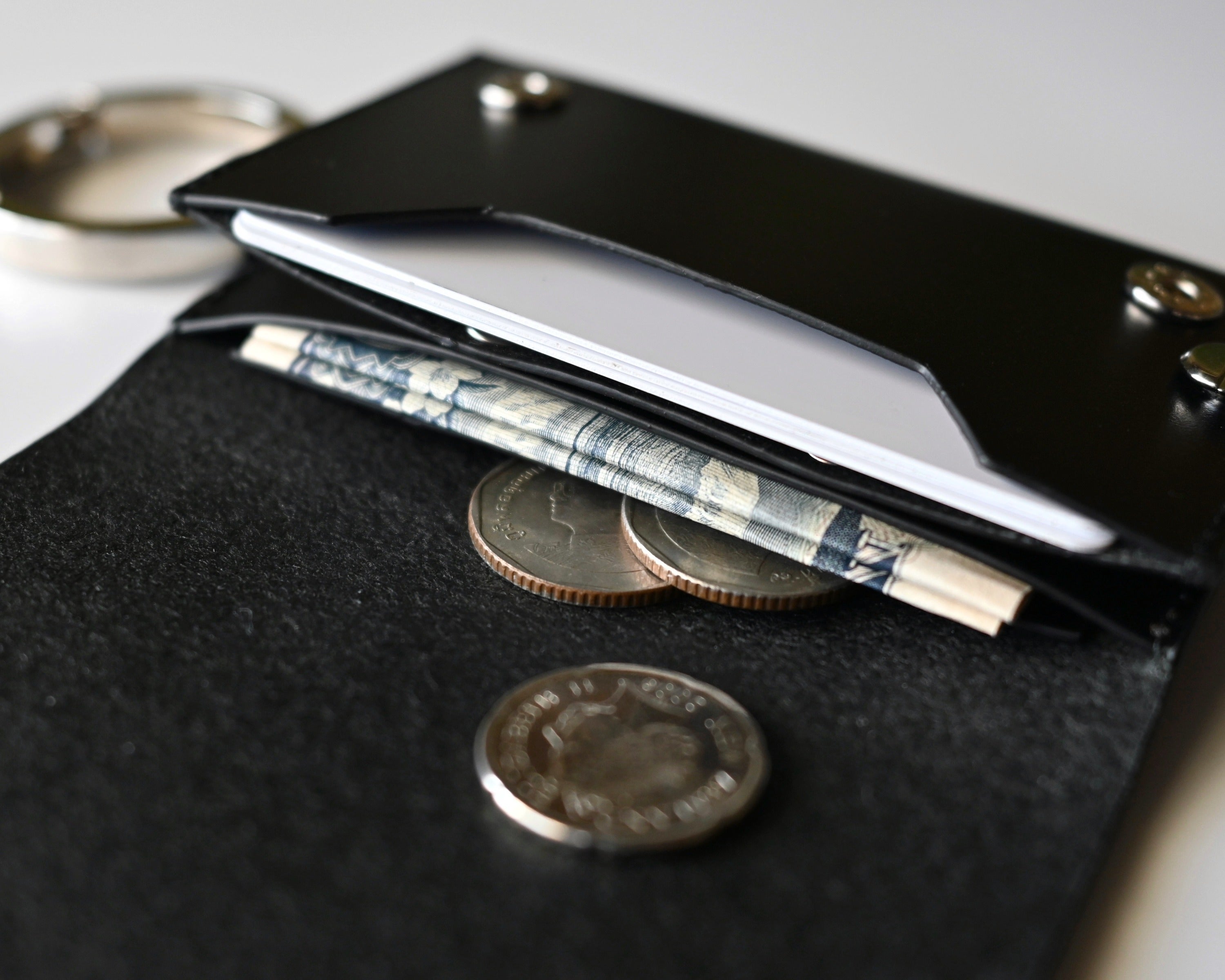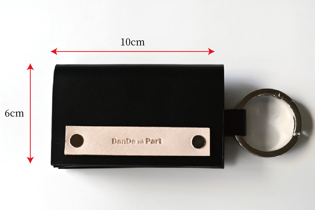 カードサイズの大きさに、鍵2本、カード3枚〜5枚、お札4枚〜6枚、小銭10枚〜15枚収納可能な万能アイテム。
