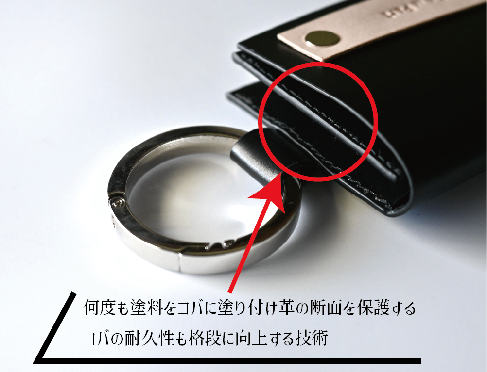 イタリア、フェニーチェ社が製造する皮革用水性コバ塗料を使用し、コバを丁寧に処理しています。