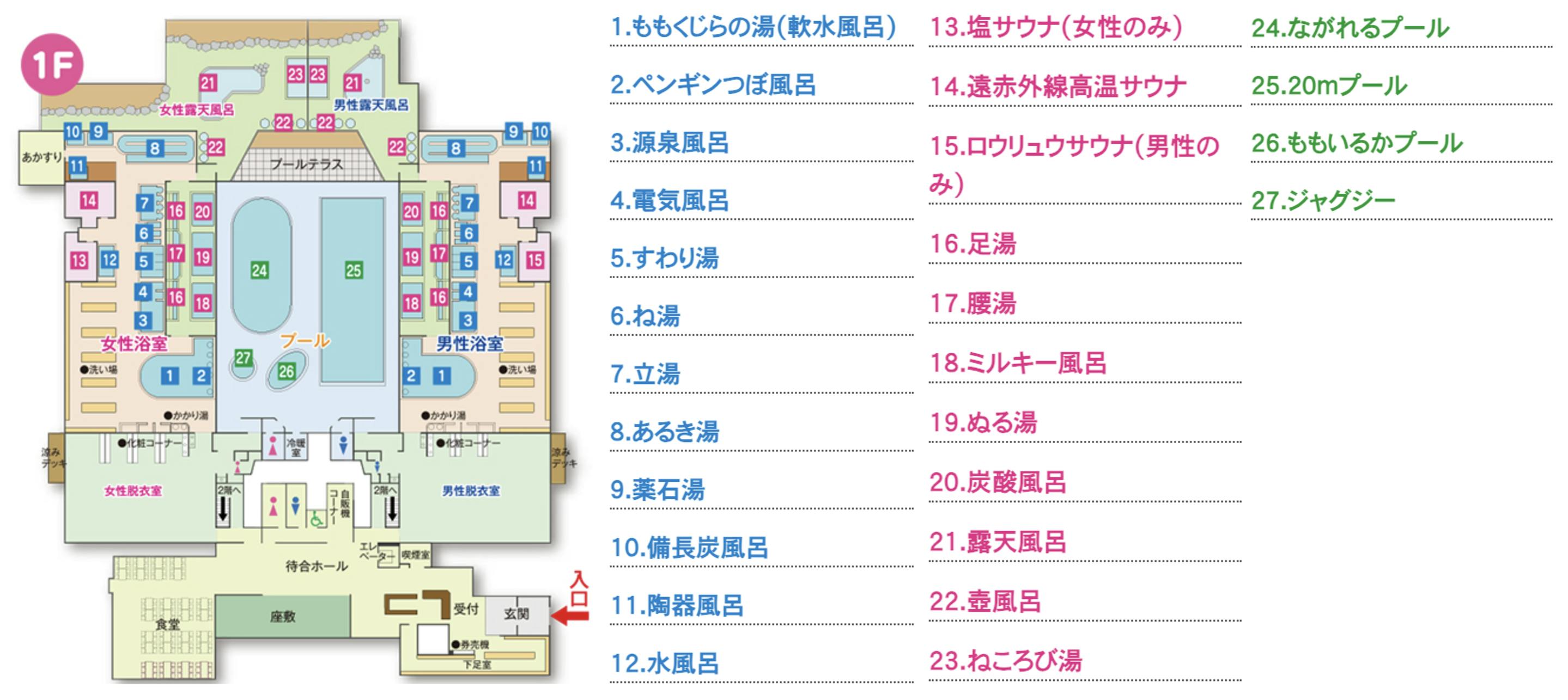 1Fには自慢の天然温泉(男性:青文字、女性:赤文字)を完備!