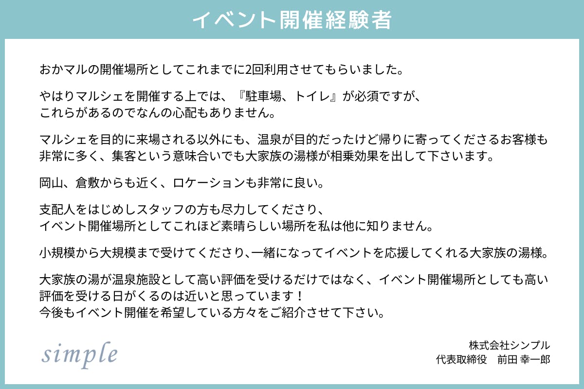 大家族の湯を愛するサポーター、これから愛してくれるサポーターと共に、大家族の名前の通りファミリーのような繋がりで地域の方々の楽しめる、癒される、愛される施設になっていきたいと考えます。