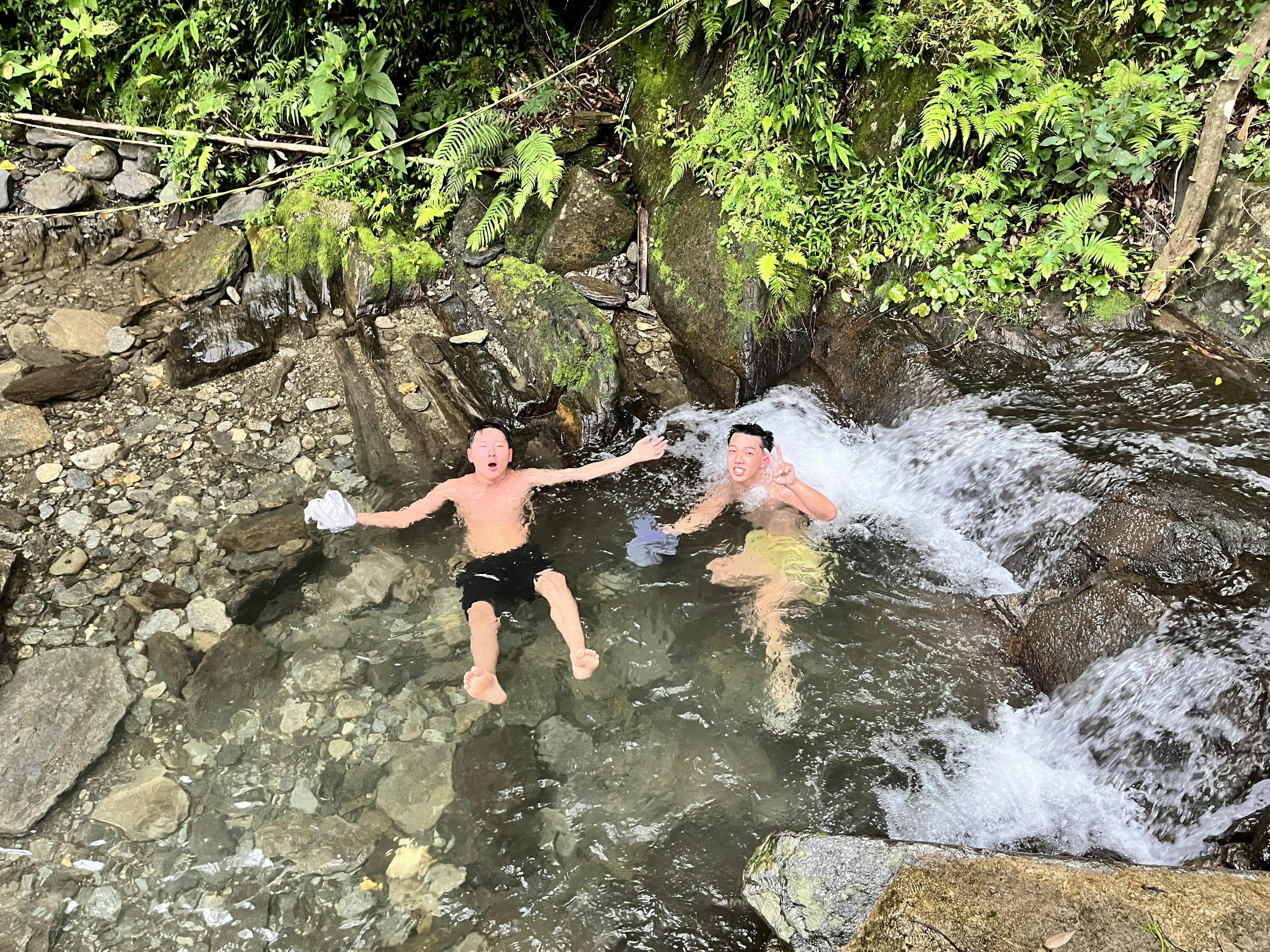 勢いよく川風呂にダイブ(写真:原田萌奈美)