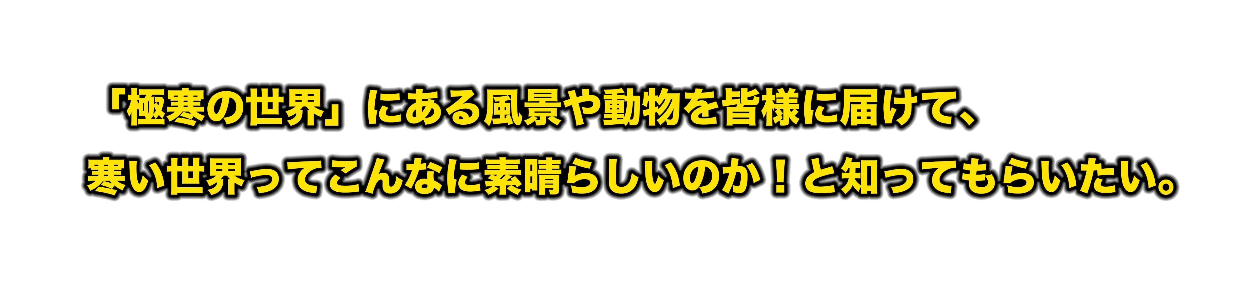 「写真は相手の感情を動かすことが出来る」これはその時に大勢の方に学ばせてもらい、今度は「極寒の世界」にある風景や動物を皆様に届けて、寒い世界ってこんなに素晴らしいのか!と感動して欲しいというのが、このプロジェクトで実現したいことの一つです。