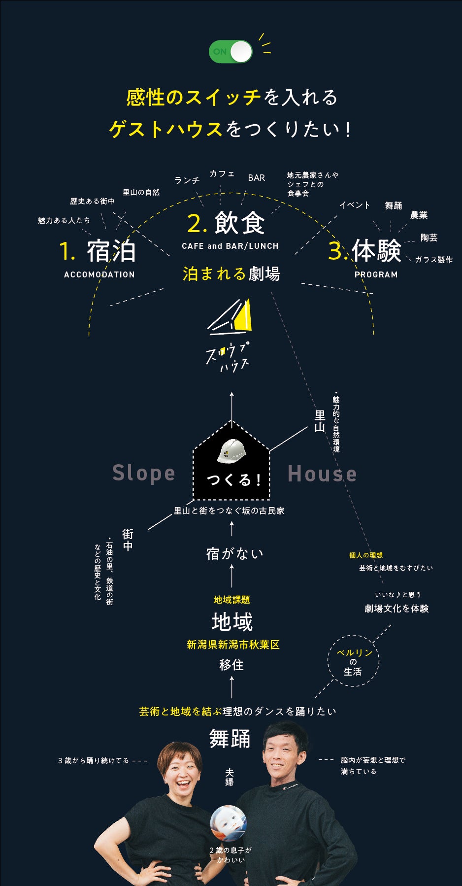 ヨーロッパで体感した劇場のように感性のスイッチが入るゲストハウスをつくりたかった私達は「あちこちに魅力があるのに泊まる場所がない」という、新潟県新潟市秋葉区に感じた地域課題に自分たちの夢を重ねる挑戦をはじめます!