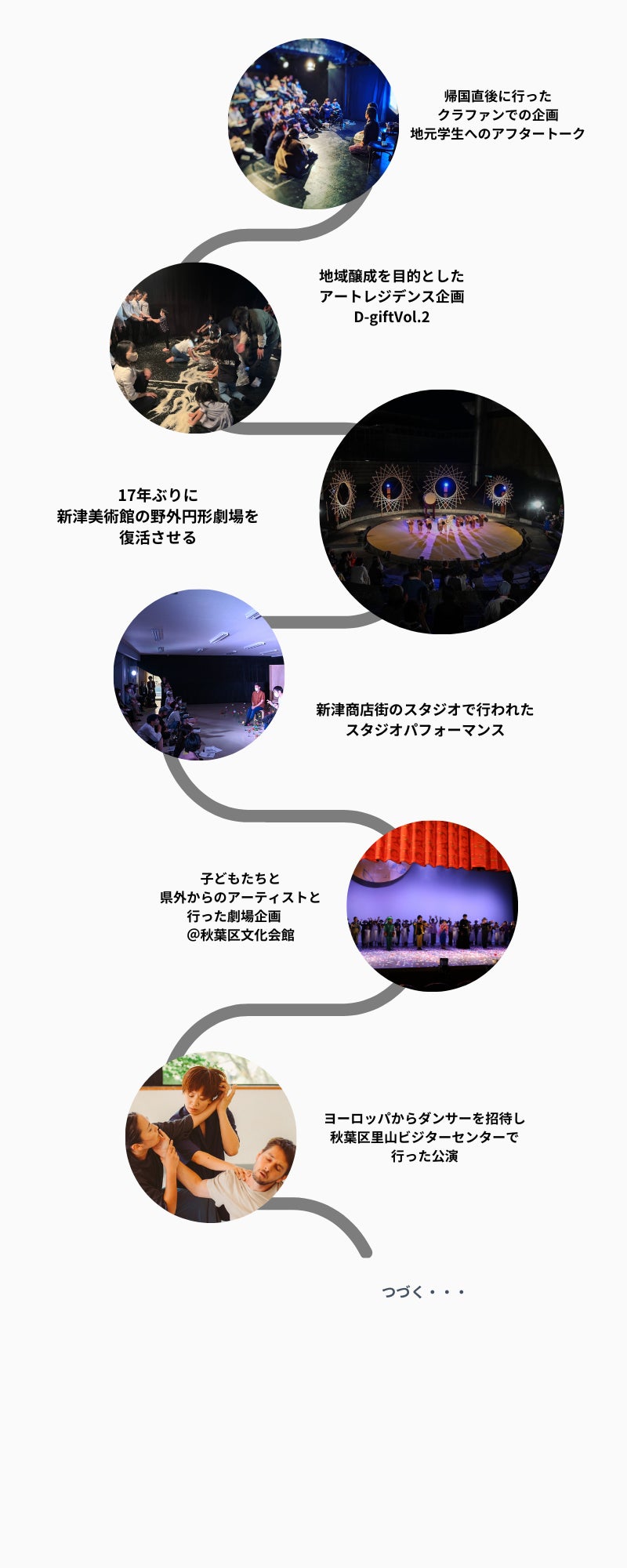 ヨーロッパで行ってきた活動。そして踊ることを通じて創造されていく関係や発見をこの地で活かすことはできないかと模索し、この3年間で県外国外から20名以上のアーティストを招き、この地での創作活動によって起きる化学反応を感じることにこだわってきました。