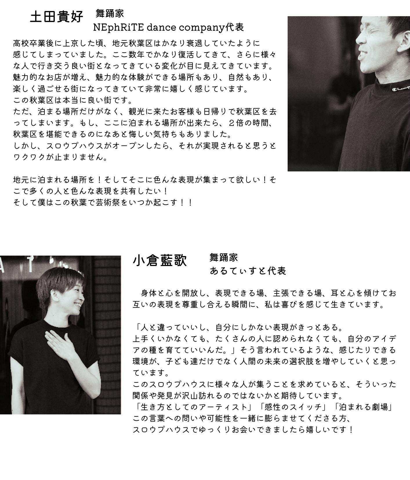 誰もが表現者。舞台の前後、心を落ち着かせる劇場での楽屋の様に嘘のない自分の表現(人生)に向かうための準備をしてもらいたい。リラックスし、交流を楽しみながら自分と向き合える空間を整え、お出迎えしたいと思っています。 滞在しながら秋葉での暮らしや制作を楽しんでもらいたいので、連泊の割引を用意しております。