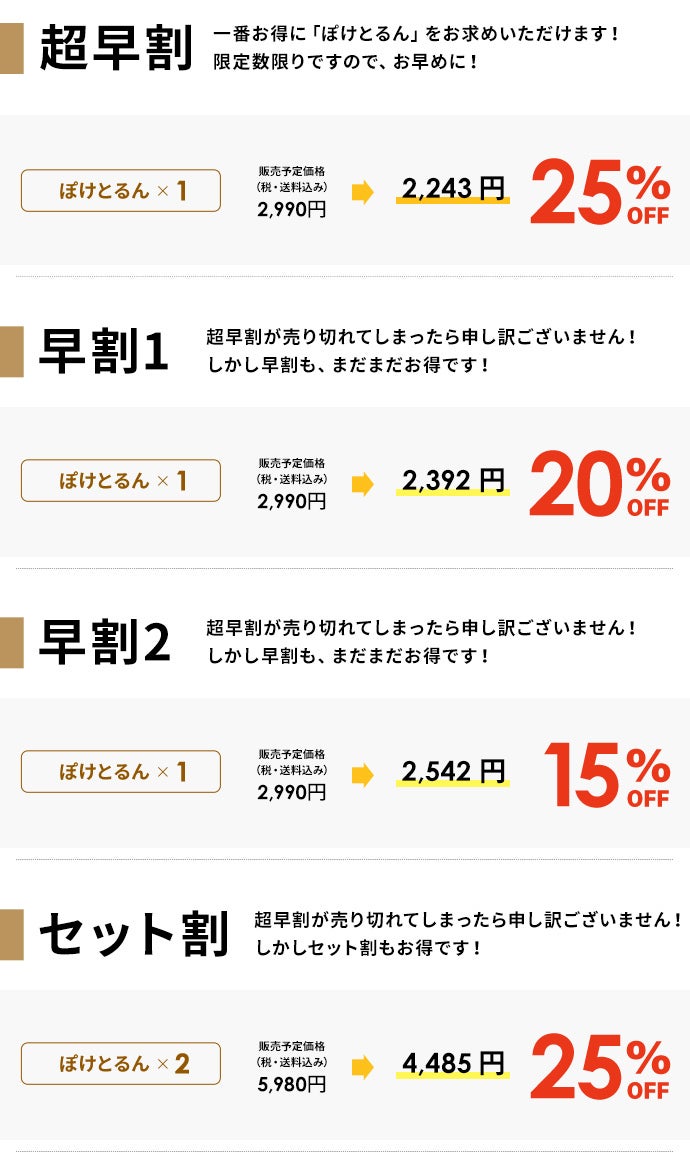 2023/09/20 10:30この度は「ぽけとるん」のプロジェクトページをご覧いただきありがとうございます。当プロジェクトは、9月19日をもちまして終了いたしました。ご支援をいただいた皆様に、社員一同、心から感謝申し上げます。製品は9月20日から順次発送を予定しており、皆様のお手元に届けられるよう準備をしております。到着まで今しばらくお待ちください。「ぽけとるん」が、皆様の暮らしのお役に立てられれば幸いです。どうぞよろしくお願いいたします。 もっと見る