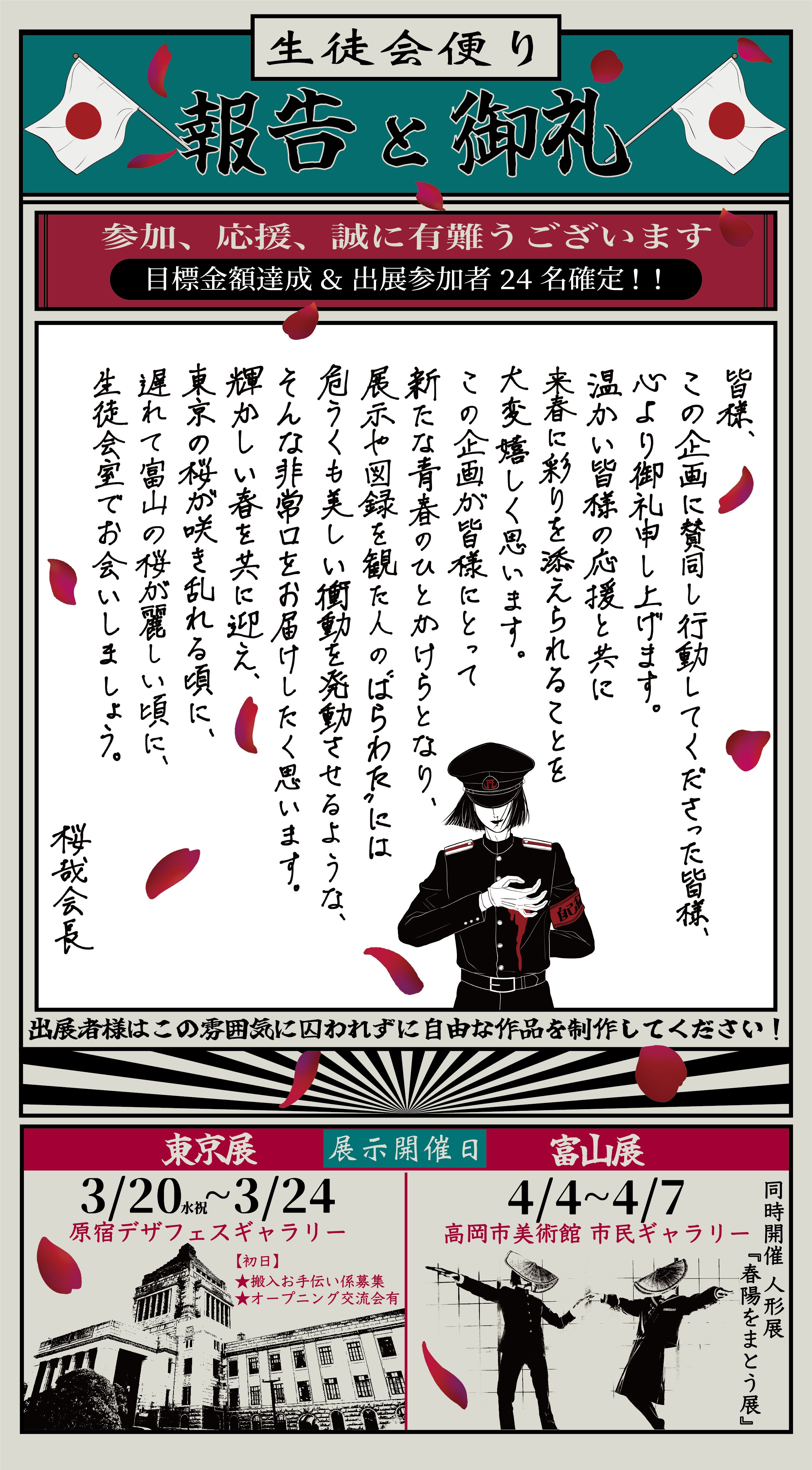 皆様、『微春機発動展』誠にありがとうございました。多くの方にご来場いただくことができました!Xの方で活動報告ツイートをしましたのでこちらには展示の写真や動画をまとめておきます。▶︎活動報告ツイート▶︎TikTok動画【東京展】デザインフェスタギャラリー 【富山展】高岡市美術館 市民ギャラリー2024年 春 皆さんと共に過ごしました。ありがとうございました!桜哉会長