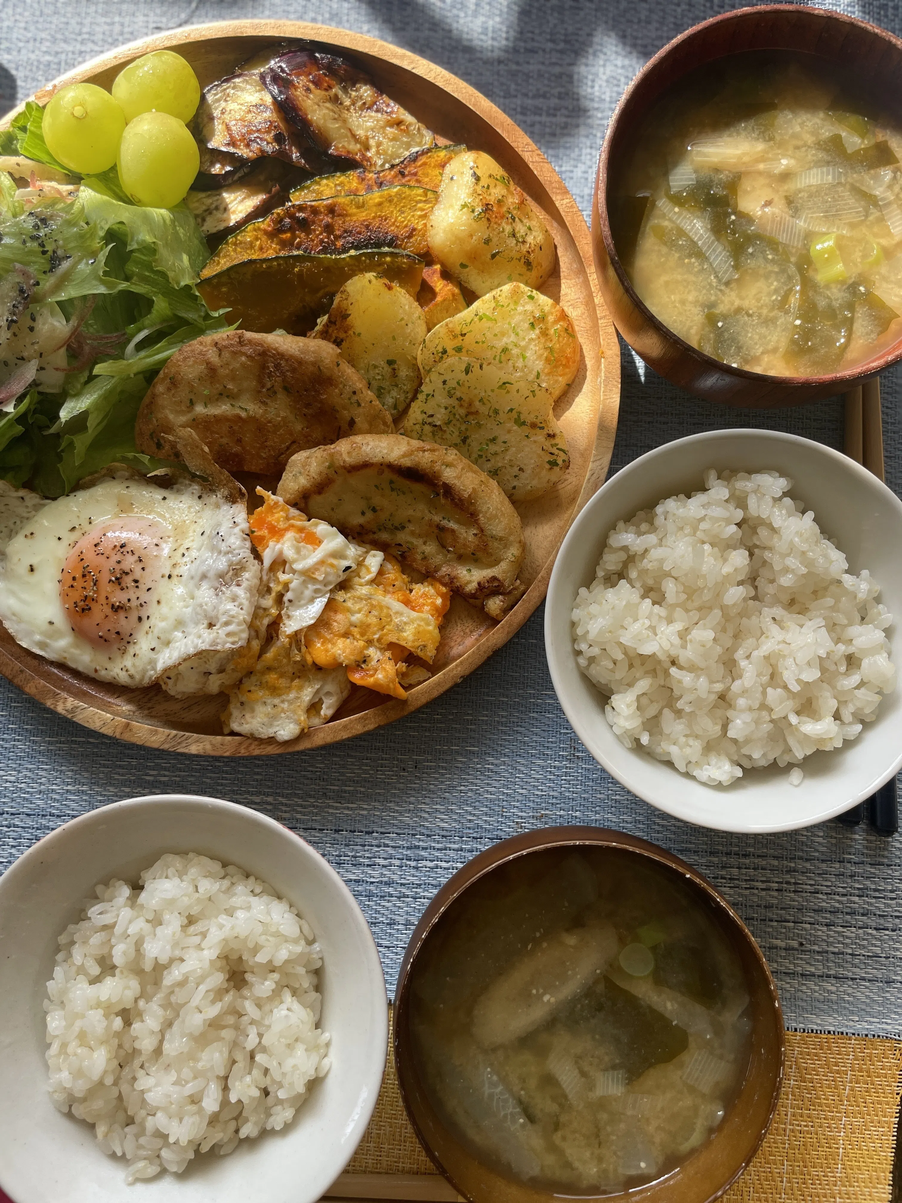 自宅では和食で菜食。卵は平飼いで、住居地の旬野菜をメインにいただきます。