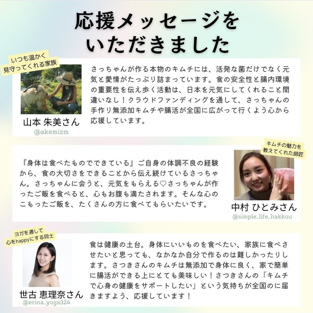 腸活キムチを食べて少しでも元気になってもらいたい。そして家族や大切な人と分けてhappyの伝染をしてもらいたい。お腹の調子をととのえて、元気になれるキムチがあることを知ってもらいたい、と。