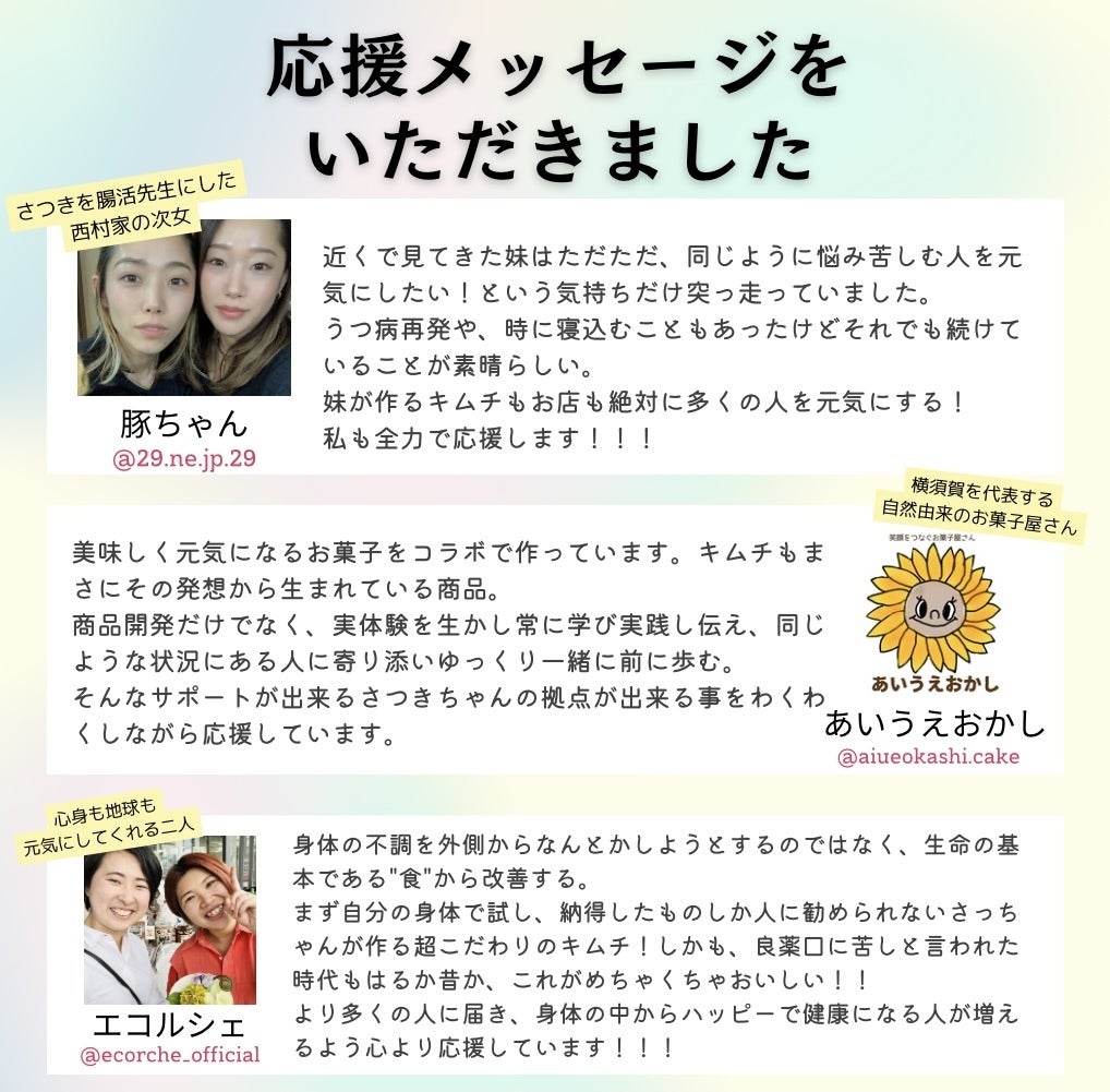 友人などに食べてもらったときに「美味しい!スーパーではもう買えない!ぜひ販売してほしい!!!」という嬉しい声をたくさんいただきました。その中でも一番嬉しかったのは「腸活キムチがきっかけでお米が食べられるようになり、便秘が解消しました!」という、私が一番望んでいた言葉です。