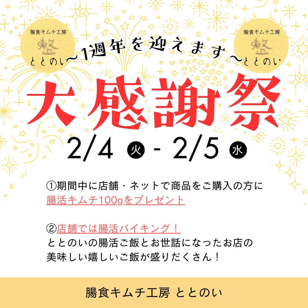 2025/01/22 17:02ご無沙汰しております。腸食キムチ工房ととのいの西村さつきです。クラウドファンディングから1年。たくさんのお客様にご利用いただき、仲間やご近所さんのサポートにより無事に1年を迎えられることを心から感謝しています。そこで感謝の気持ちを込めて、一周年感謝祭を開催いたします!!ご支援いただいた皆様にも、ぜひご利用いただけると嬉しいです。____________________________________________________________2月4日・5日限定①店舗では腸活バイキングを開催(11:00~15:00)②ネット販売・店頭では商品をご購入のお客様に腸活キムチ100gをプレゼント____________________________________________________________2日間限定となります!そして、リターンをまだお受け取りでない方へ。①腸活キムチを店舗で受け取り②朝食券こちら使用期限はございませんが・・・たまに顔出していただけると嬉しいですん(*'ω'*)ぜひぜひお立ち寄りくださいね★ということで、ととのい1周年!皆様と作り上げたこのお店を引き続き大切にしていきます!今後ともよろしくお願い致します。腸食キムチ工房ととのい 西村さつき もっと見るオープンまであと3日
