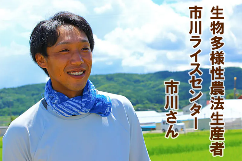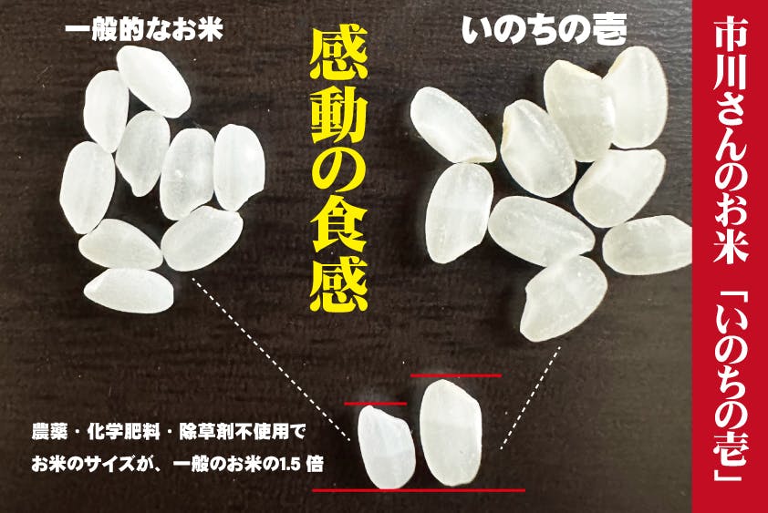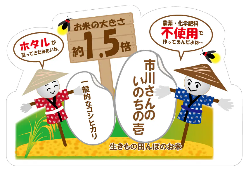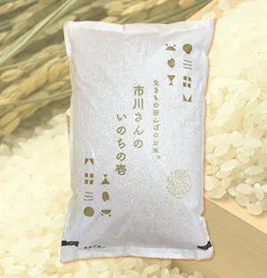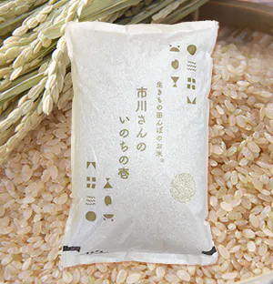 長野県佐久市の米農家、市川さん率いる若手農家達が、農薬・化学肥料・除草剤不使用で育てた、「生きもの田んぼのお米 市川さんの いのちの壱」です。
