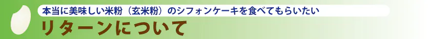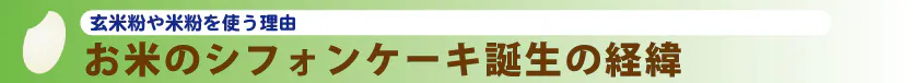 当社が米の消費拡大の方策として、米粉の加工品を考えており、その商品の一つとして米粉のシフォンケーキを試作している事を話したところ、せっかく加工品を作るならば、体に良い玄米粉で作れば良いじゃないですかと社内で声があがり、玄米粉を製粉してもらう製粉所探しからシフォンケーキの開発が始まりました。
