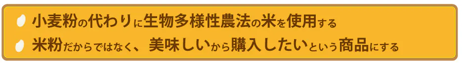 米の消費量が減少をたどる中、消費拡大の一つの手法として加工品の商品化に挑戦いたしました。ふるいの下に落ちた粒の小さいお米や、砕けた米の「特定米穀」を使用するのではなく、農薬・化学肥料不使用の米として販売している食用米を使用いたしました。食用の米として適正な価格で原材のお米を調達しています。