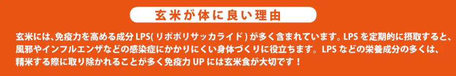 健康の為に重要なことは腸内環境を整える必要があります。玄米の胚芽の部分には微生物を蓄える働きがあるあり、胚芽を除かずに食べることで、その食べ物からも微生物を身体に取り入れることができ、腸内環境を整えることが出来ます。