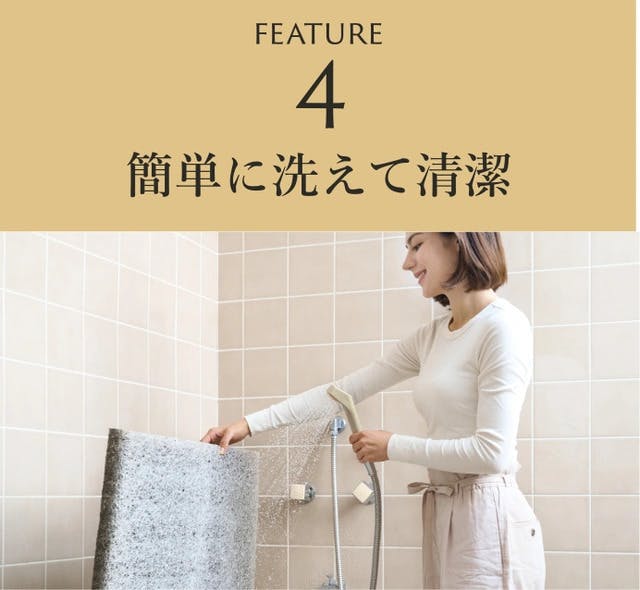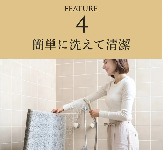 カバーは取り外して洗濯機で洗えることはもちろん、マットレスの中材も全て洗えます。中材はシャワーで汚れを洗い流せて、シャワー後は日陰干しをするだけ!