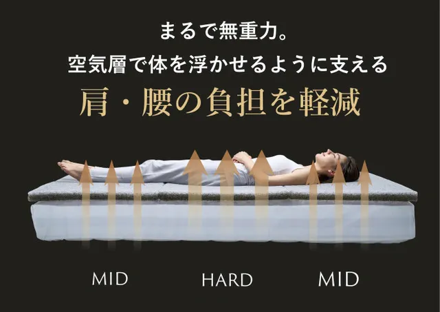 重力がかかる腰部は硬く、肩と脚は柔らかく支えるパーツごとに硬さの異なる設計で理想の寝姿勢をキープします。