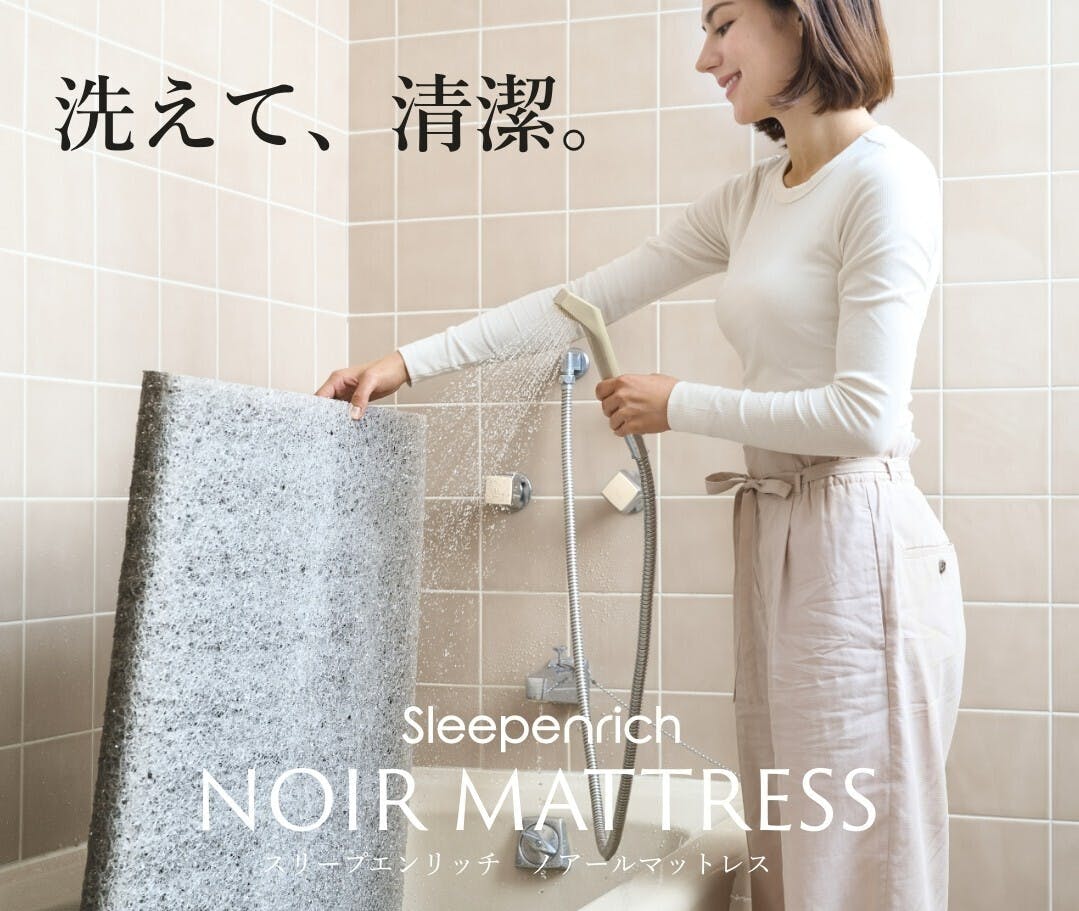 「スリープエンリッチ ノアール」は、ファイバー素材を使用したマットレスで、ご自宅のシャワーを使って簡単に汗や汚れを洗い流すことができます。定期的なお手入れで、清潔で快適な睡眠環境を保つことが可能です。