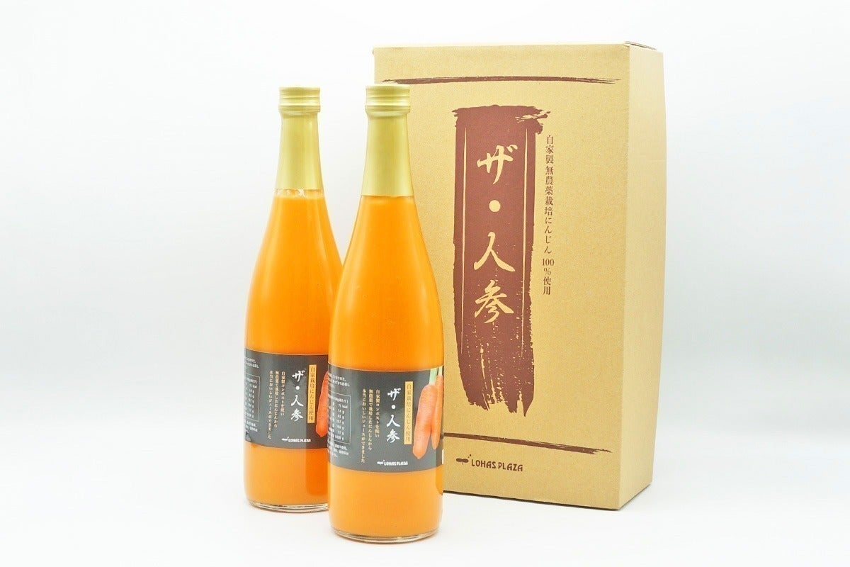 ①自慢の人参ジュースと、農薬や化学肥料を使わずに育てた人参をお届けします。
