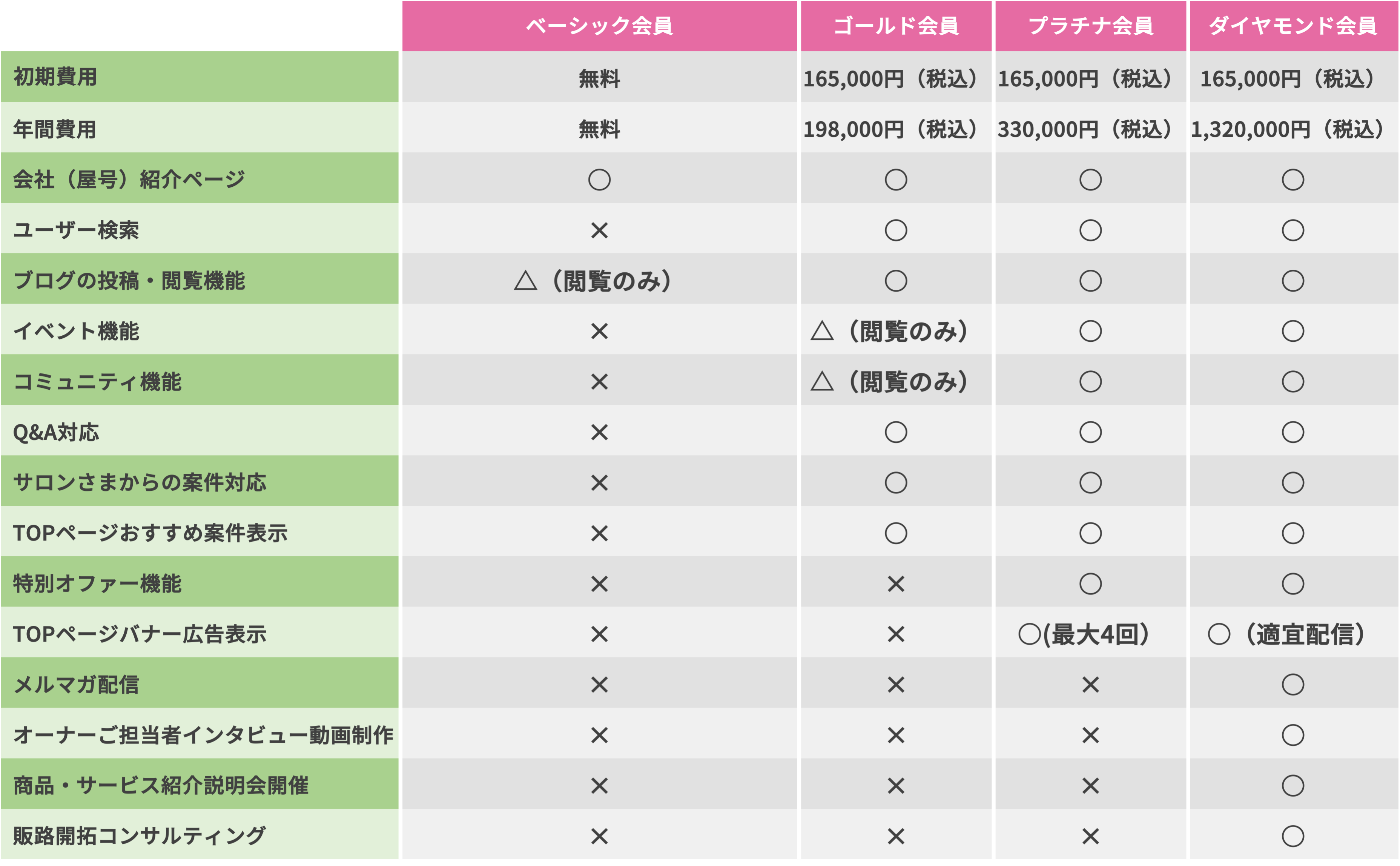 事業者向けプランには、ベーシック、ゴールド、プラチナ、ダイヤモンドの4種類がございます。