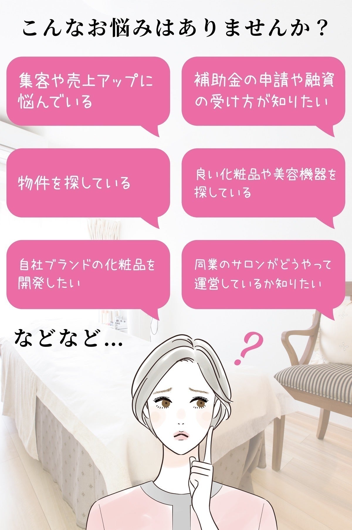 エステ関連の事業を行う士業、メーカー、ウェブ関連の事業者の方々など、以下のようなお悩みをお持ちではありませんか?