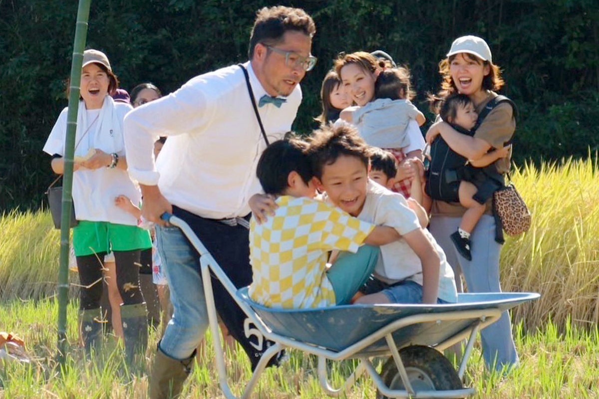 田植えや稲刈りの体験に、『食』『農』『音楽』をミックスさせたイベントで、いろいろなお店に出店もしていただき、ピザを焼いたり、DJが音楽を流したりと田んぼとは思えないほどの大盛り上がり。秋には田んぼでの大運動会も開催。一輪車レースや竹引きなどを大人も子どもも、みんな一緒になって楽しみました。