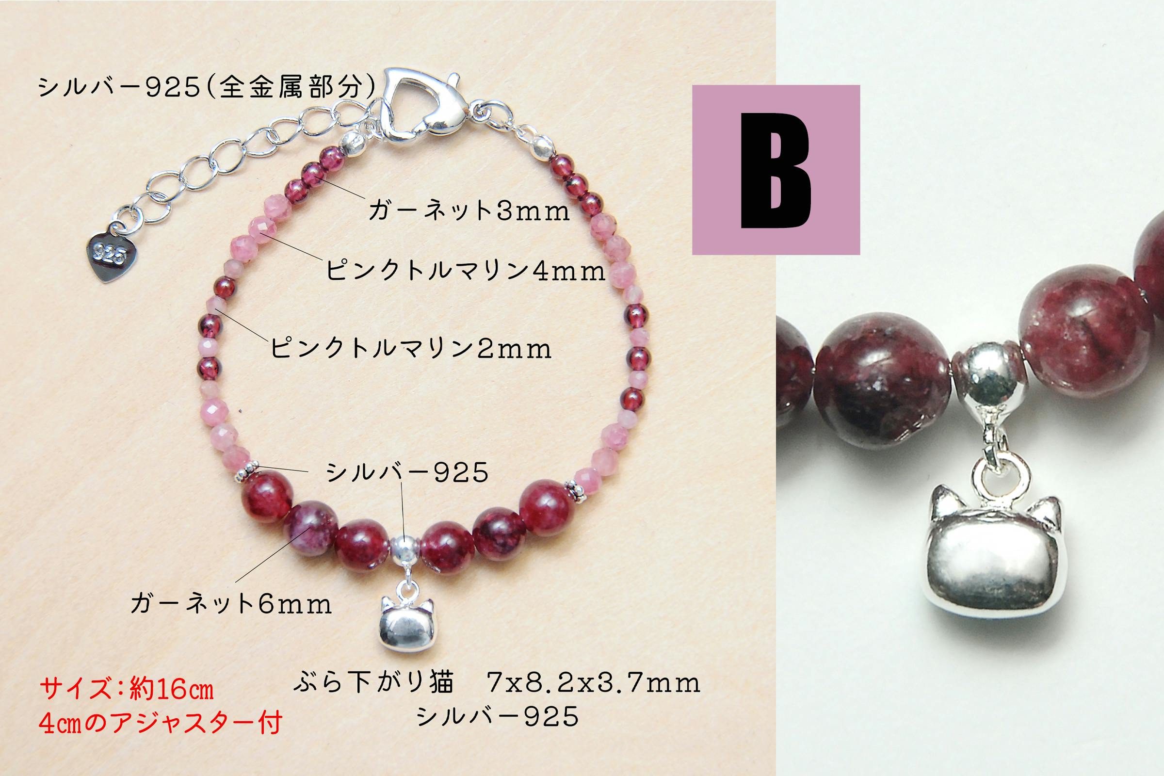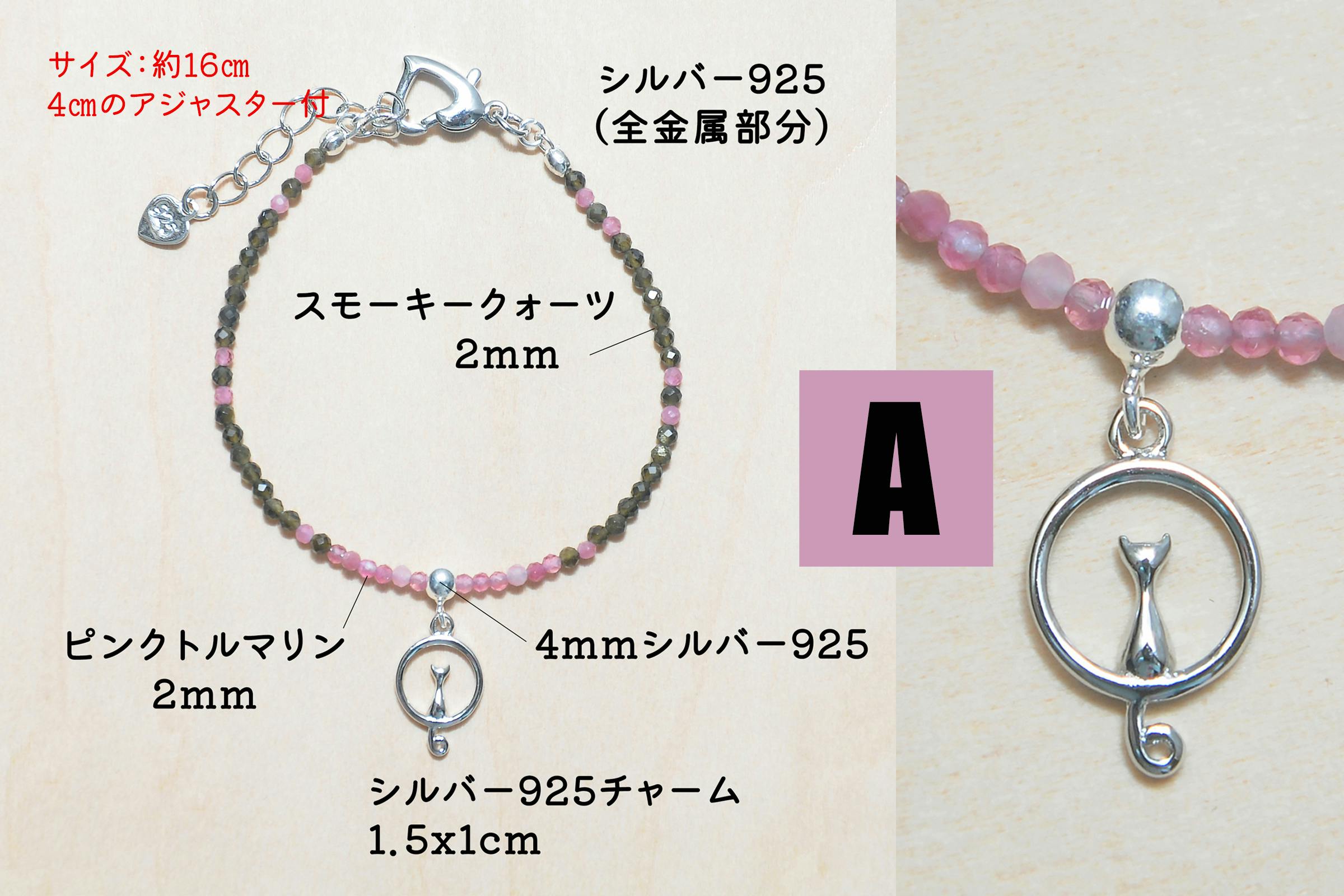 シルバー925の猫型チャームの付いた天然石ビーズのブレスレットを2種類ご用意。