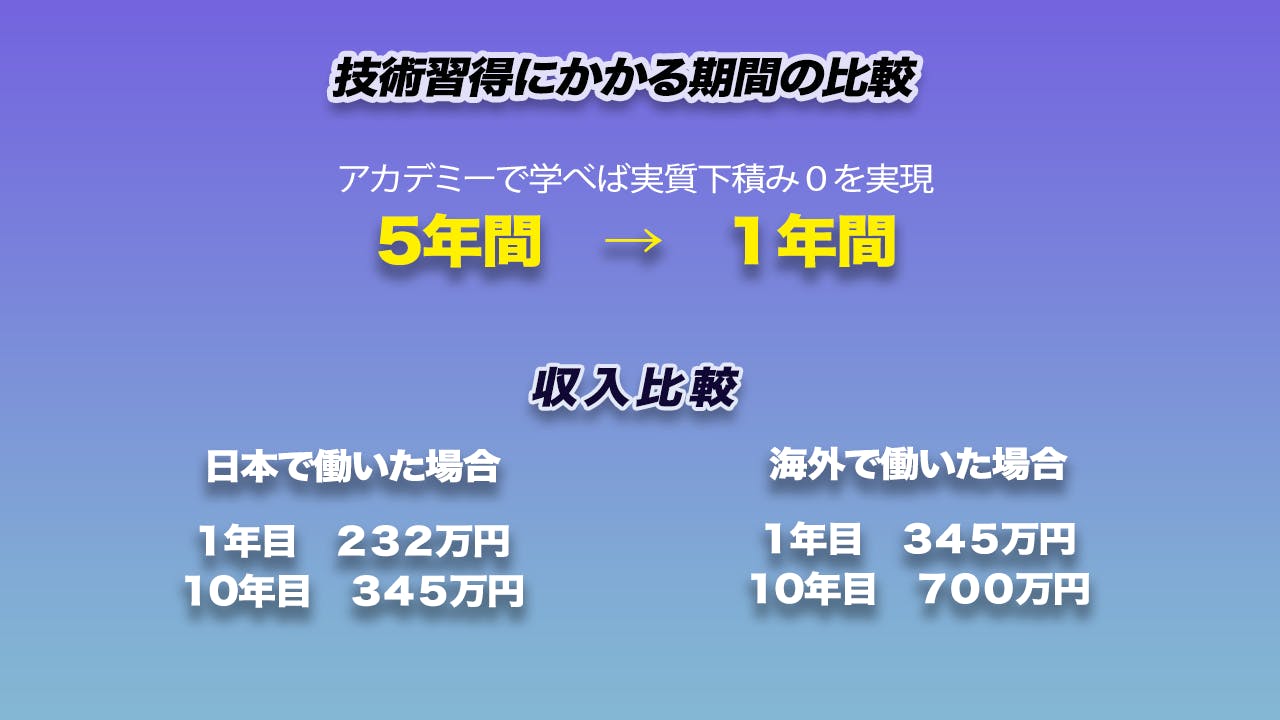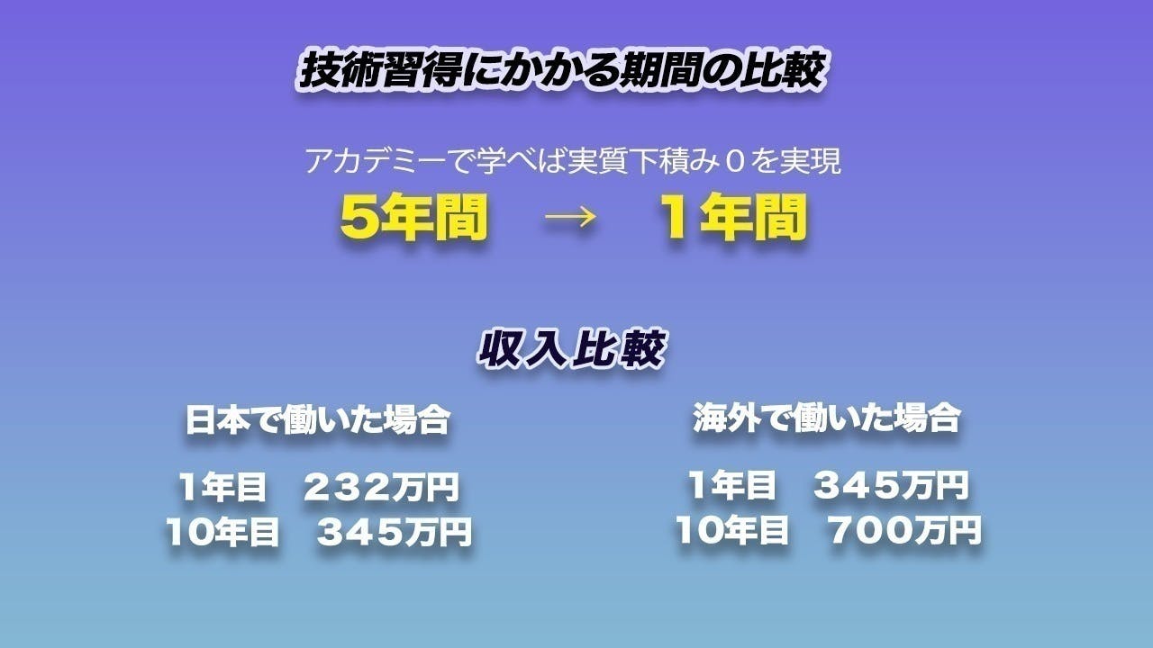 アカデミーで実現したいことは下積み期間Oで質の高い技術者の育成です。