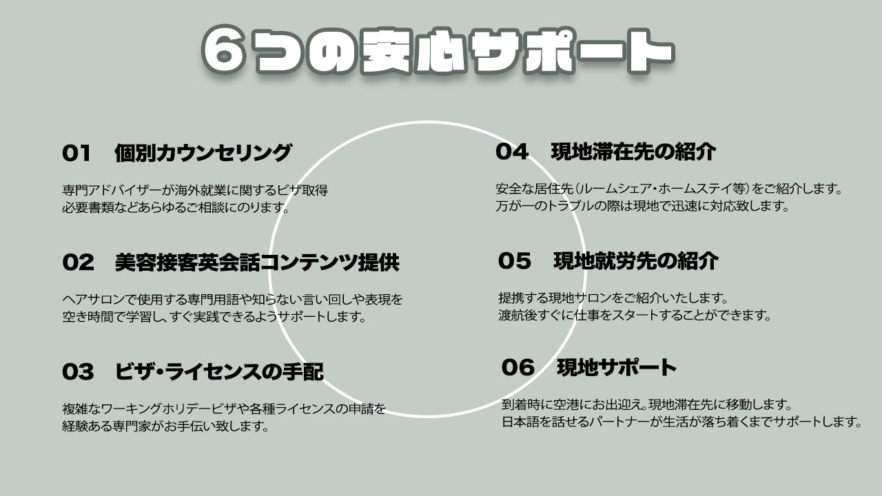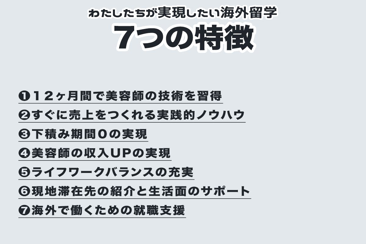 私たちは海外へ挑戦する美容師の皆様に最高のサポートを提供する日本初の美容師留学を実現します。