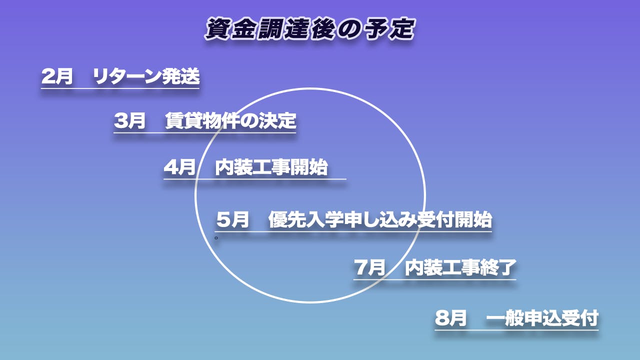 大部分は自社資金でプロジェクトを進めていきますが、クラウドファンディングで集まった資金は施設設備費の一部に当てさせていただきます。