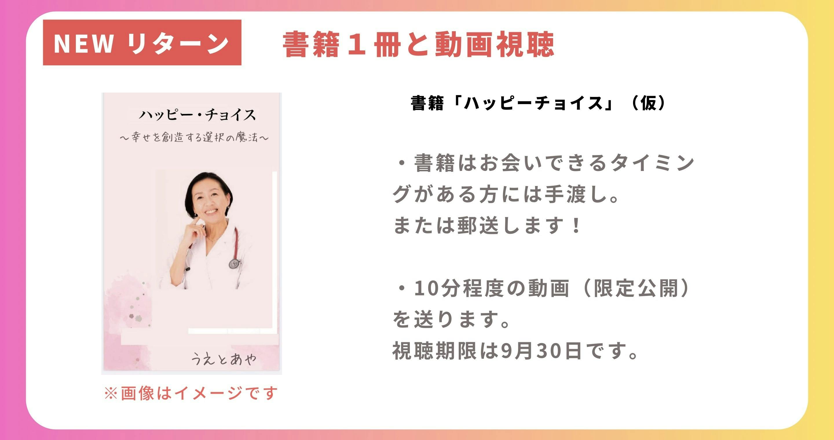 書籍「ハッピーチョイス」(仮)1冊、お会いできる方は手渡し、または郵送いたします。