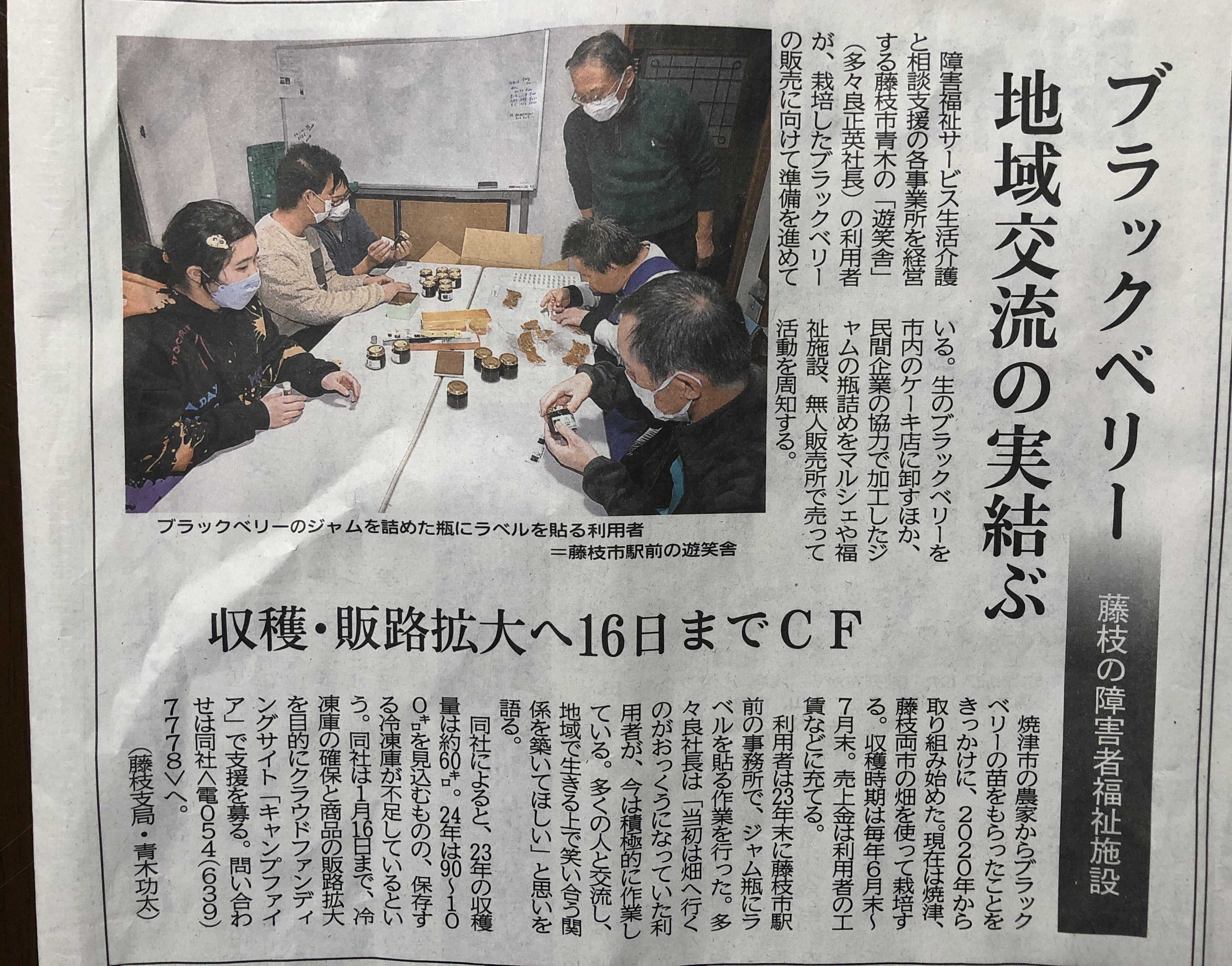 静岡新聞より遊笑舎のことを取材して頂きました。1月9日(火)の新聞に写真のよう記事が載っています。ブラックベリーのことや、遊笑舎で働いている人たちのこと、またクラウドファンディングのことなどが記事になっています。新聞を通して遊笑舎の活動や目標を皆様に知ってもらうとても良い機会を頂けました!またクラウドファンディングの支援金が目標金額を超え60万円に到達しました。本当にありがとうございます。クラウドファンディング終了期日まであと5日。最後までご支援頂けたらと思います。どうぞよろしくお願い致します。
