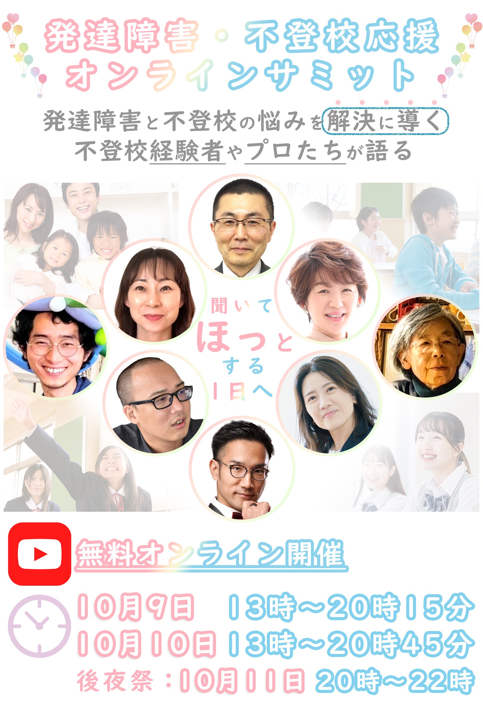 10月9日(月・祝)、10日(火)に「発達障害・不登校 応援オンラインサミット」を開催し、YouTubeで無料配信いたします!