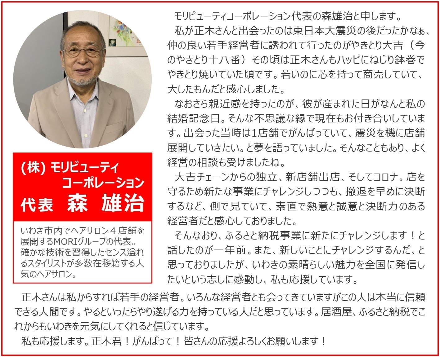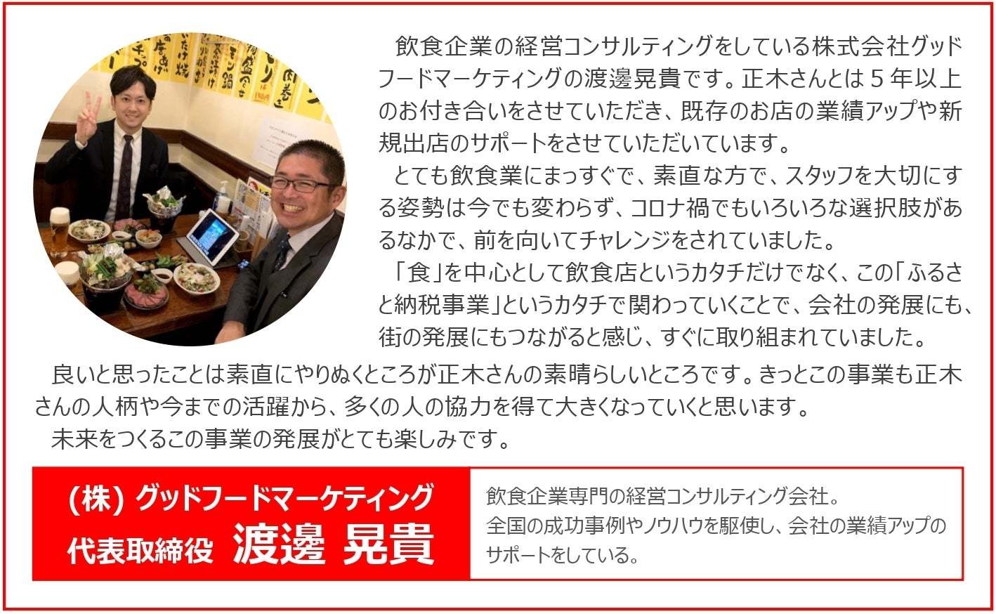 いわき市で飲食店を経営している(株)ありがとうカンパニーの正木聡です。