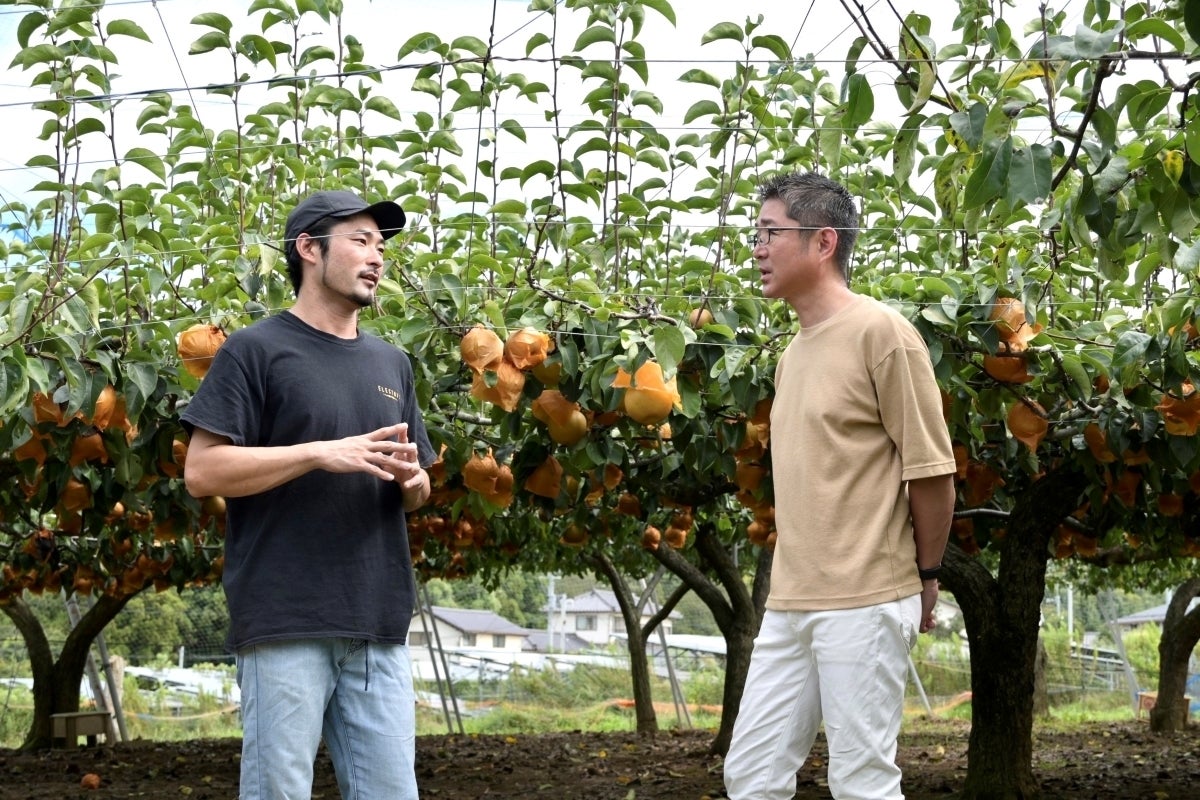 梨の生産者 根本果樹園の根本大我さん(左)
