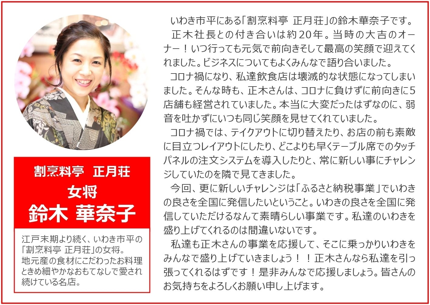 今回のクラウドファンディングを通じて、当社のふるさと納税事業を強化し、いわき市といわき市の魅力ある特産品を全国に発信できるよう全力を尽くしてまいります!皆さまからのご支援、ご協力、どうぞよろしくお願いいたします!