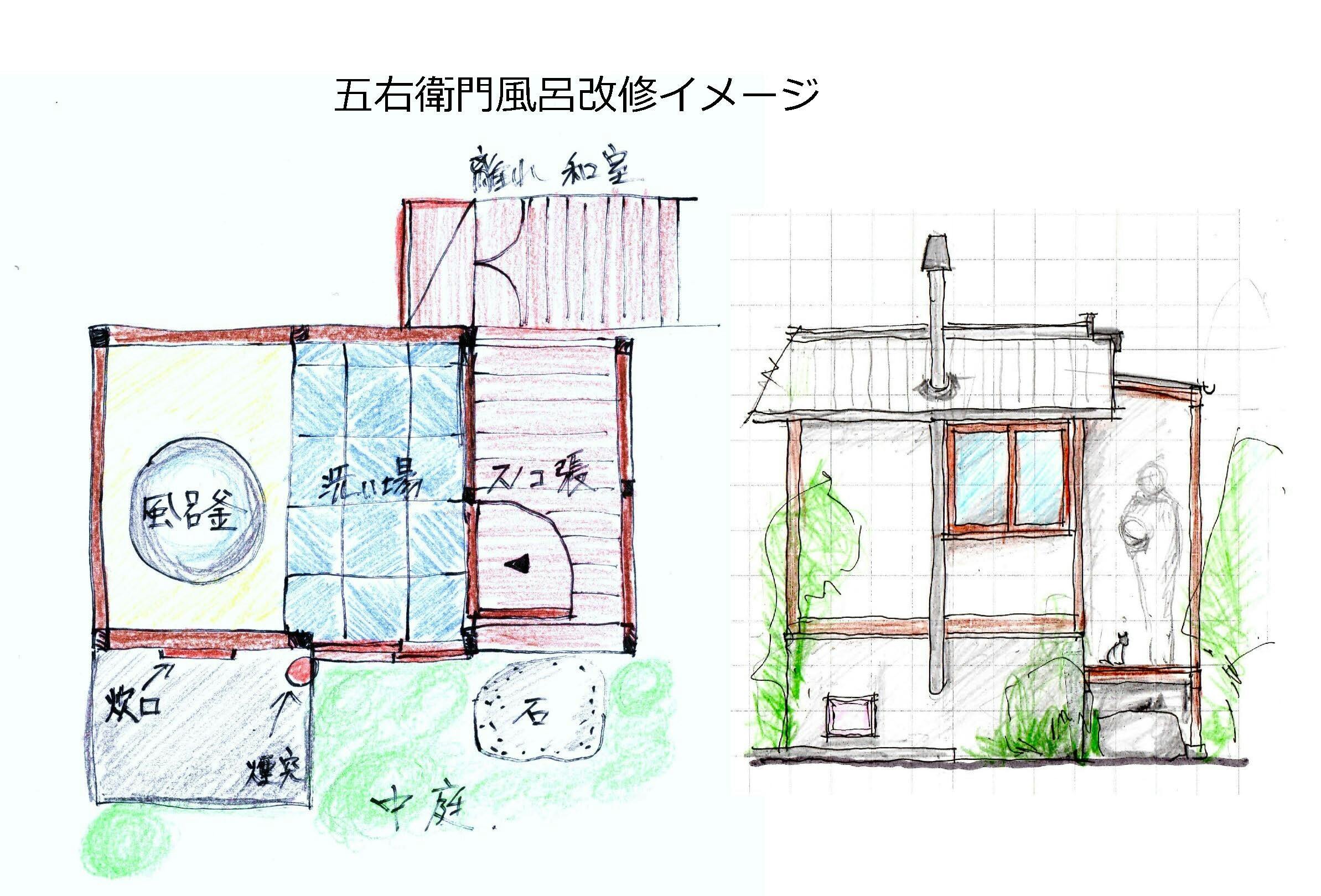 夏に現在の風呂場の測量を行い、岡山で五右衛門風呂を施工できる匠を探して、釜屋・離れを改修した棟梁と共に、工事の具体化に向けて、設計等の計画を練っています。風呂場の改修費用は300万円の見積です。
