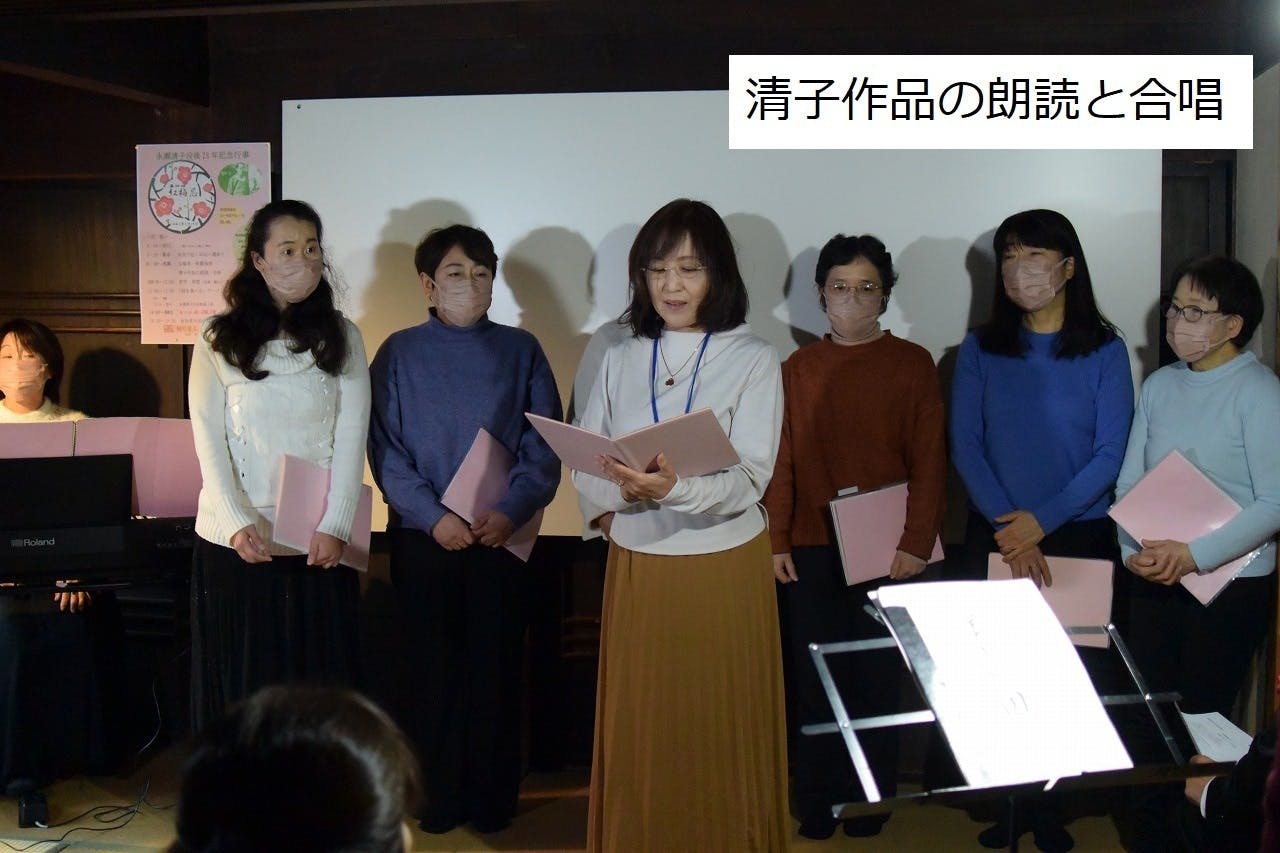 清子の家では詩作講座・朗読会等のほかにも、清子の誕生日で命日である2月17日にその時期に咲いていた紅梅にちなんで「紅梅忌」のイベントを開催しています。今年2月の第四回紅梅忌では、墓参りの後、清子作品の朗読、地元コーラスグループによる、清子作詞の磐梨中学校校歌の披露などにぎやかな集いを開催しました。