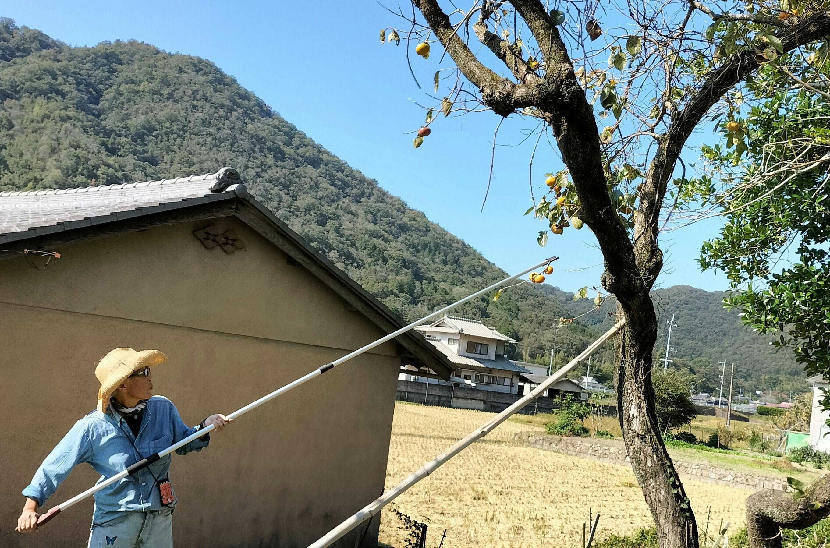 「清子の家」井戸の奥の柿の木がたわわ。詩人・絵描きの岸田さんが、8時から柿の実の収穫を始めてくれていました。