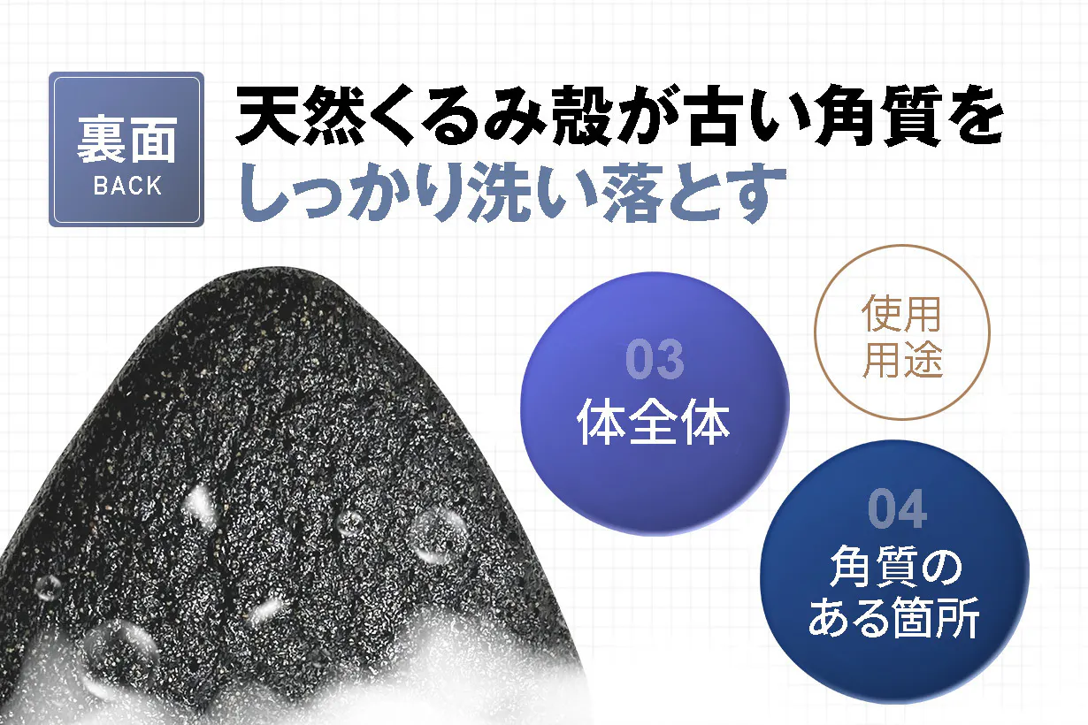 細かなクルミの粒子が、肌を傷つけず、汚れだけをしっかり絡め取ります。