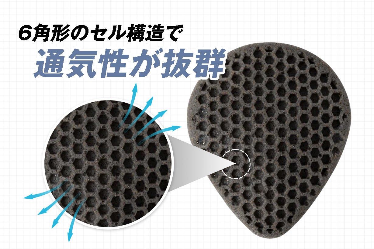 ハニカム構造が空気や水分が流れる通路を形成。 通気性が高いので湿気や蒸れを軽減し、速乾性を向上します。