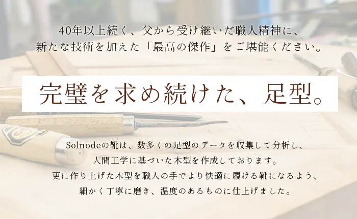 私たち「Solnode」は手作りにこだわり、一つ一つの靴に日々忙しく生きる女性たちへのエールを込めて靴を作っております。履いた瞬間から、女性たちの足に心地よくフィットするような、しなやかで品質の良い靴を、熟練した技術によってお届けできるよう試行錯誤を繰り返してまいりました。