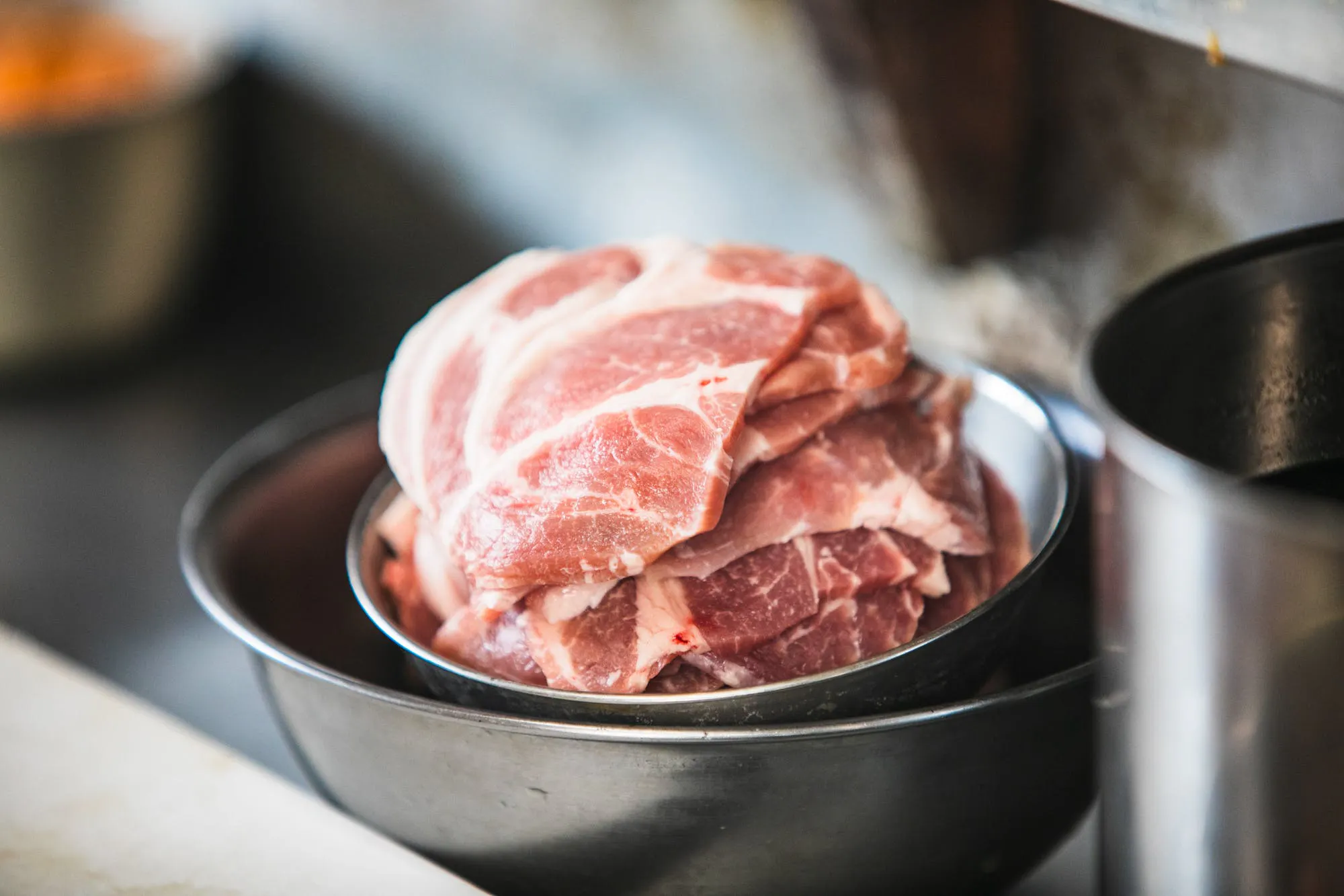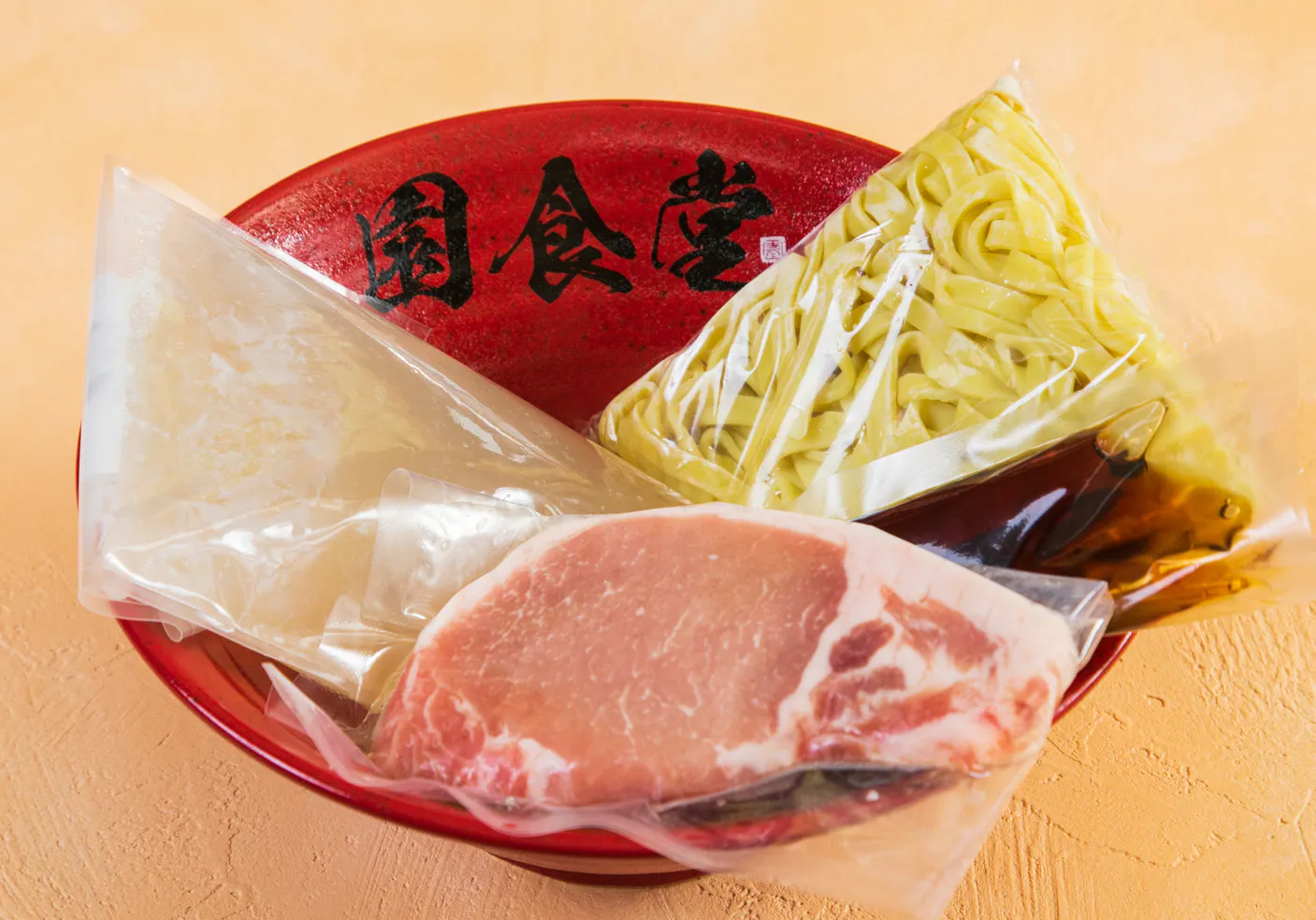 園食堂の肉タンメンには肩ロース薄切りもトッピングされていますが、この度の商品は焼きムラを防ぎ自宅で調理しやすい豚ロース肉100g1枚にしました。