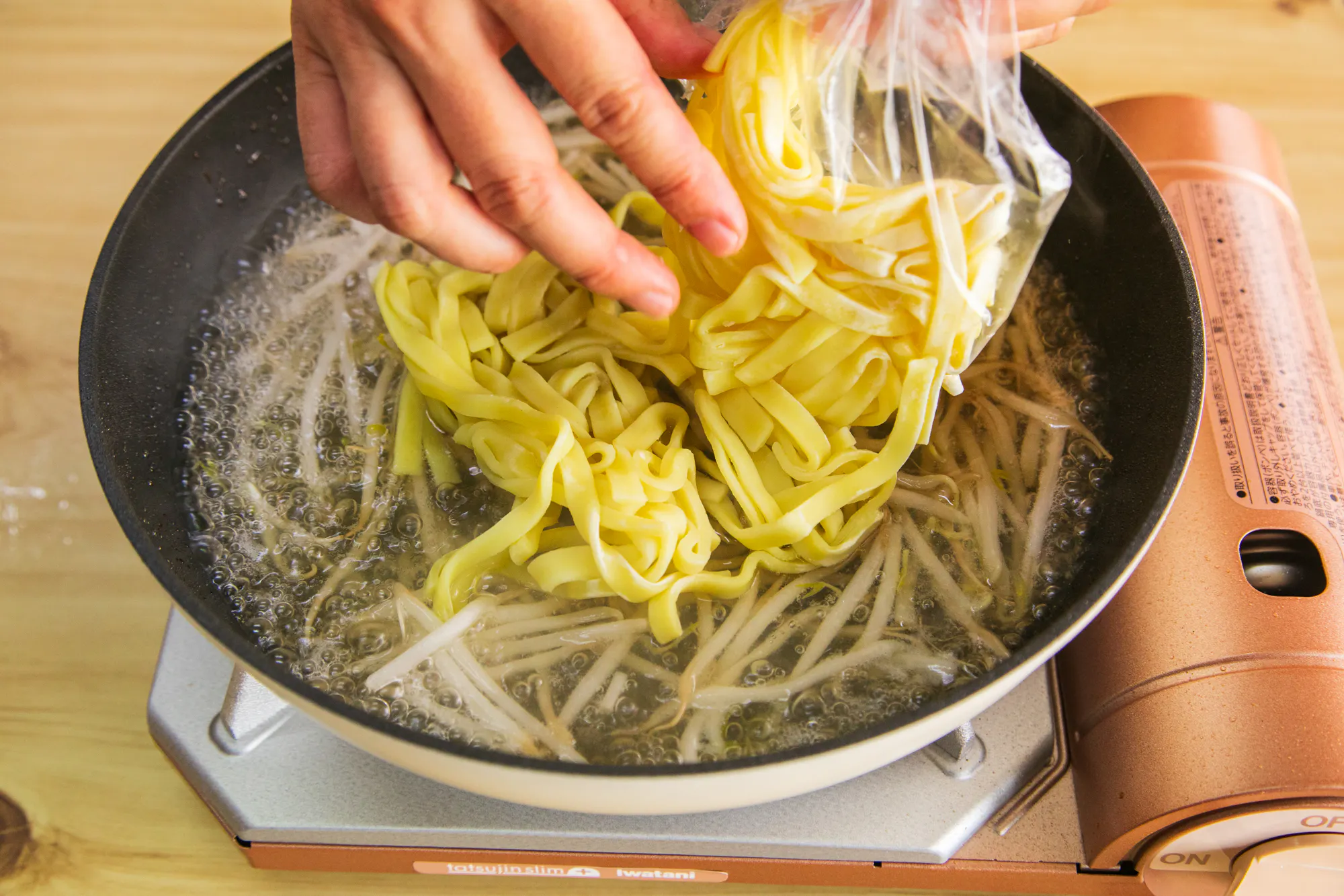 ご家庭ではフライパン一つで調理できるようにしました。豚肉にはしっかりと焼き色を付けて焼いた後、肉とタレは一度取り出します。残っているタレは洗い流さずに、そのまま同じフライパンにスープを入れます。