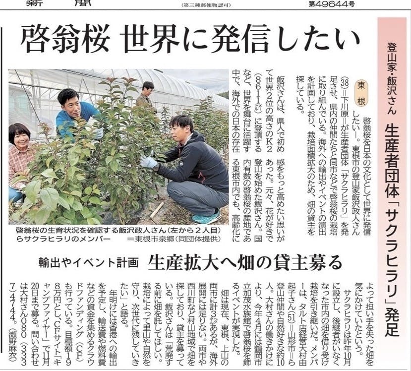 山形新聞さんよりサクラヒラリについて取り上げて頂きました。畑が必要なこと、その理由。畑を通る近所の方々からも私達になら貸しても大丈夫と思ったからと畑を紹介したいとお声がけをいくつか頂いていてありがたく嬉しく思っています。手入れされた畑は美しい景観を作ります。託された大切な土地をしっかり守っていきたいです。