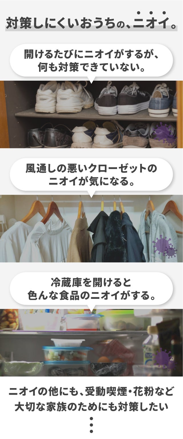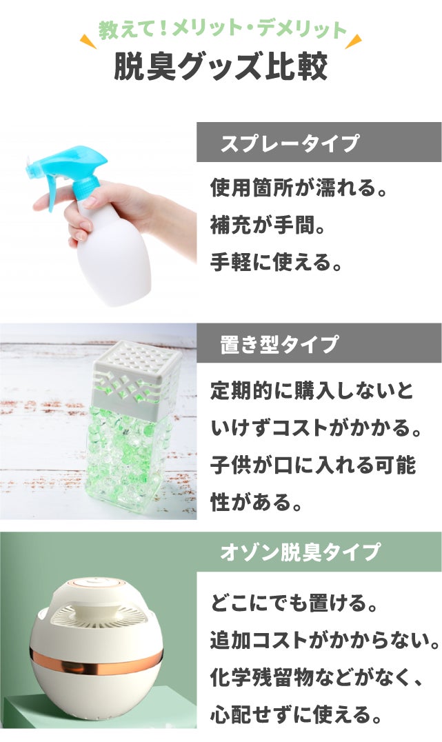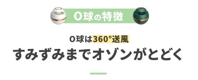 消臭グッズは、スプレーやUVライト、芳香剤など様々な種類がありますが、O級は気体であるオゾンを360度に送風するので、複雑にモノがある場所でも均一に届き消臭することが可能です。
