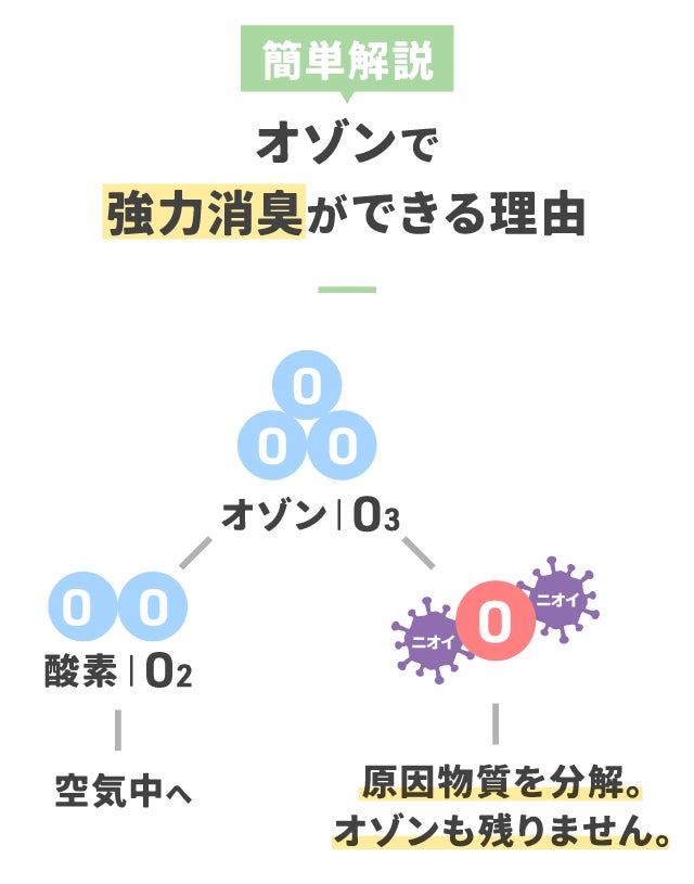 酸素は分子で安定するという性質から、余ったひとつの酸素原子は積極的にニオイの原因物質とくっつき酸化→分解します。
